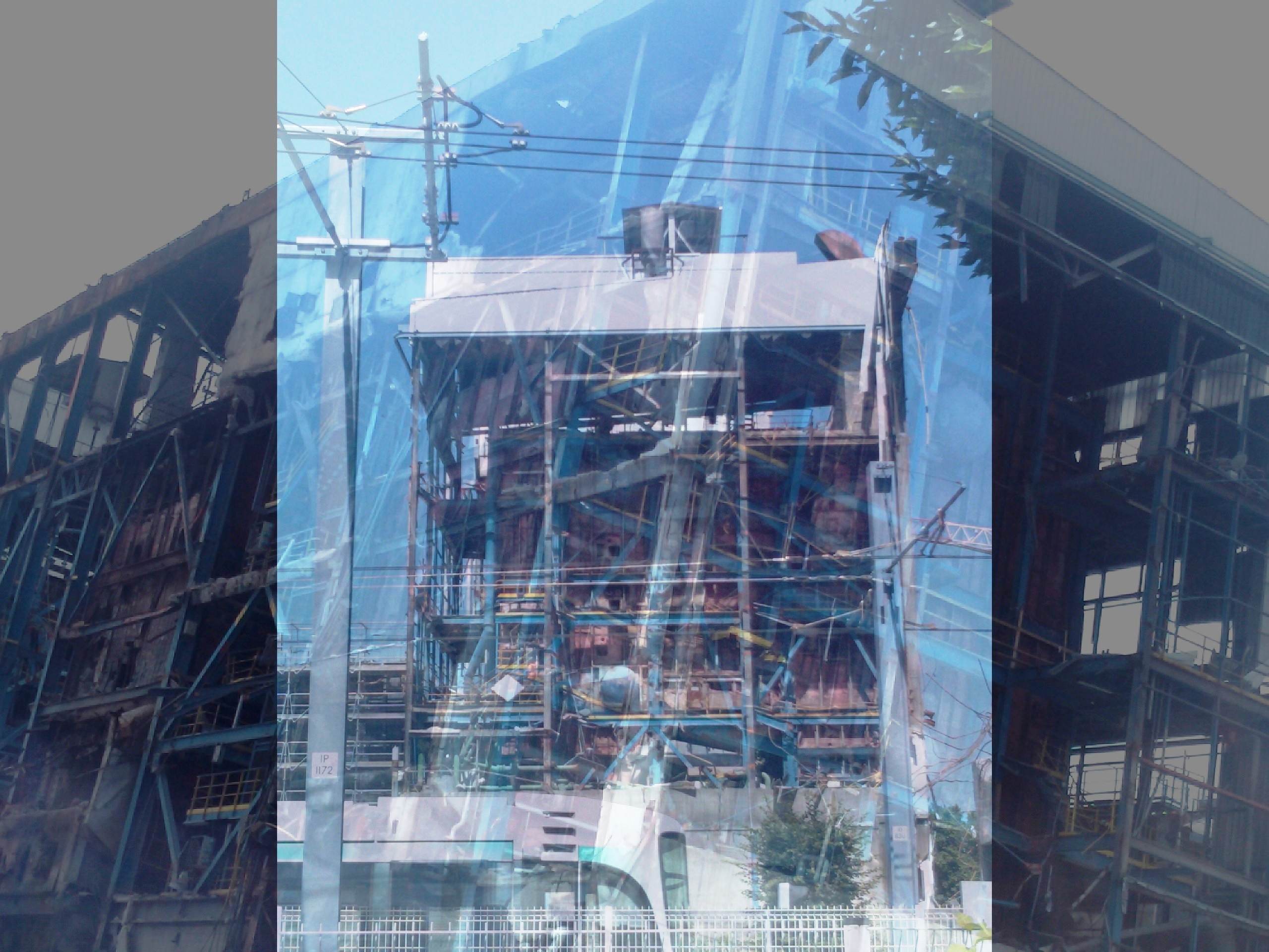 Ce montage (2 photos entremêlées) est celui de l’ancienne usine d’incinération d’Issy les Moulineaux en cours de destruction. L’usine, située en bord de Seine, dans un quartier de bureaux mais à quelques encablures d’immeubles d’habitation, est finalement démantelée après plusieurs années d’inactivité.La vue des entrailles béantes de l’usine laisse une impression étrange : tuyaux enchevêtrés, métaux, canalisations en tous sens, conduites, cheminées tordues… On ne sait quelles substances sont à l’œuvre, quels matériaux les bulldozers concassent et broient, martèlent et cisaillent. On ne sait ce que les sols alentour ont bu, avalé, digéré pendant les décennies d’activité et les mois de démolition.On frissonne même légèrement en se disant que tout se passe à ciel ouvert, sans protection particulière, au milieu du tissu urbain. On frissonne inexplicablement en pensant aux rejets de toutes ces années (voir ici) sans information particulière des riverains. On frissonne en pensant à l’immense trou noir de la gestion des déchets et plus généralement à notre œuvre consciencieuse de pollution de notre environnement. Mais bon tout cela est un peu futile ; de belles affiches vantant le formidable programme immobilier qui se monte sur les ruines de l’ancienne usine sont déjà visibles. L’appartement témoin est pour bientôt.