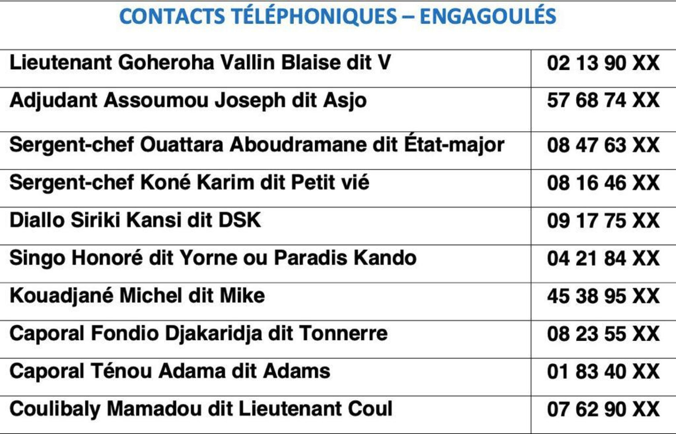 − Sergent-chef Ouattara Aboudramane dit État-major : Tel. : 08 47 63 XX
