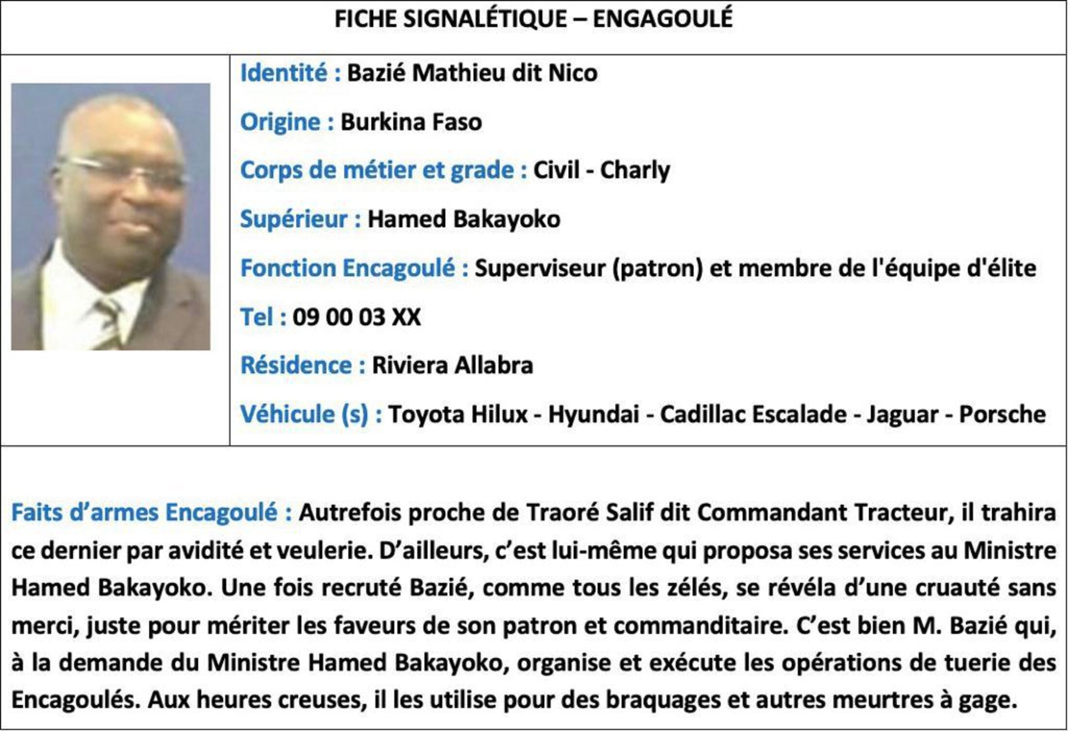 Au vu des compétences des uns et des autres, de leur loyauté et au fil des missions qui leur ont été confiées, Bazié Mathieu dit Nico avec l’accord du Ministre Hamed Bakayoko son patron, a mis en place une équipe restreinte de choc au cœur de la milice des Encagoulés. Cette équipe d’élite est composée entre autres de :
