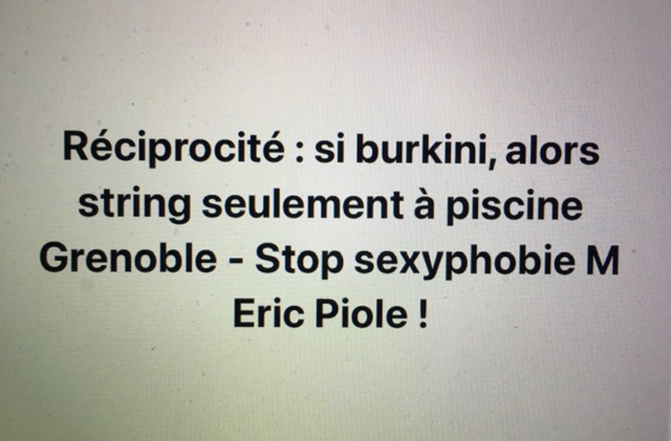 Si łe burkini, vêtement très couvert, typé islam pudibond (qui doit cacher cou, avant-bras, mollet pour motif intégriste religieux pas pour le froid) pour piscine est autorisé à Grenoble (ou ailleurs : Rennes déjà), alors le mini vêtement de bain, très peu couvert, soit le string seulement (seins nus) doit l'être aussi : stop sexyphobie d'Etat et réciprocité possible des tenues. Après c'est comme chacun-e veut . Encore faut-il pouvoir légalement : changeons le code pénal sur ce point (renvoi aux juristes spécialisés) !
