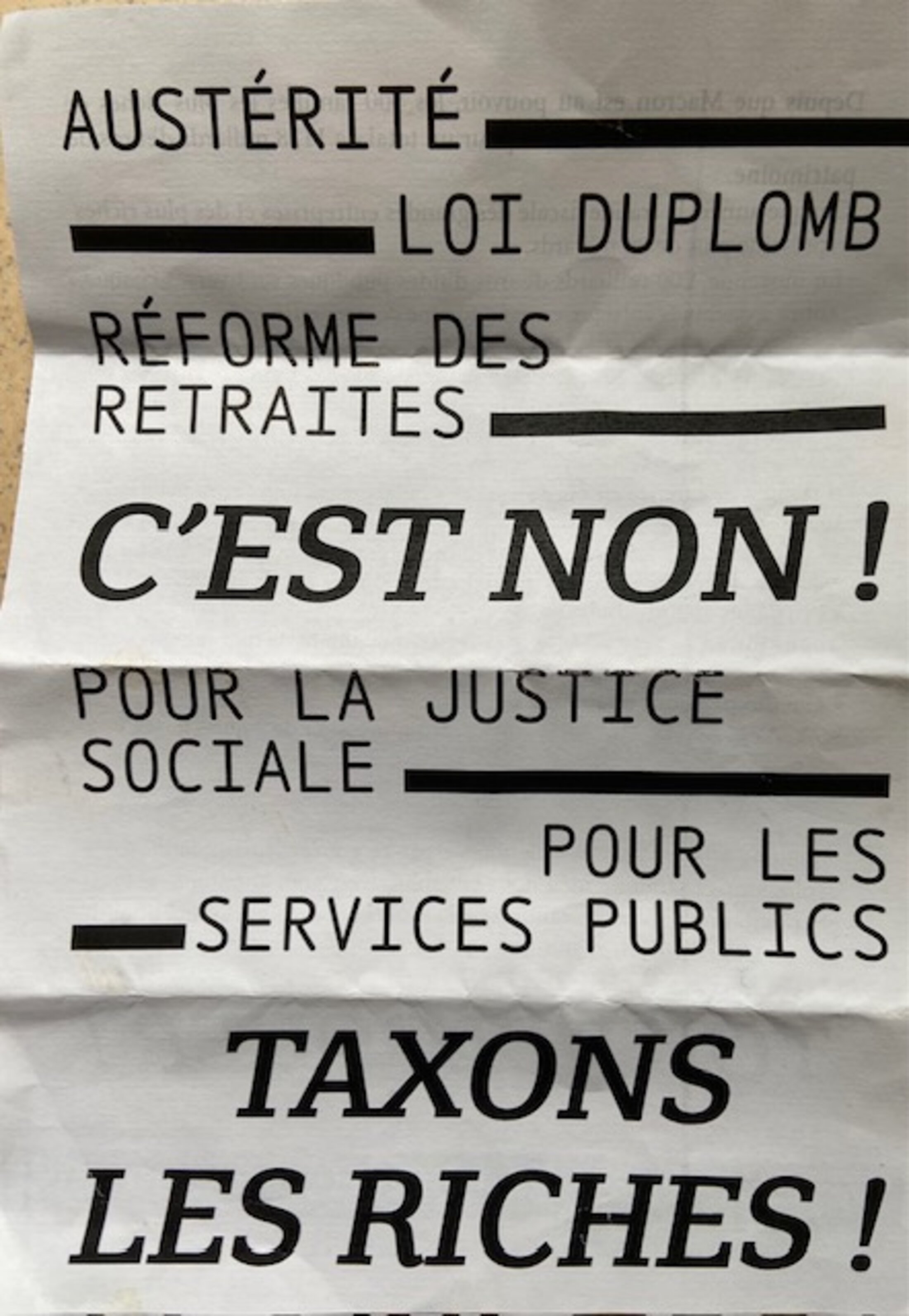 1 - TAXONS LES RICHES : Vu cet argumentaire simple en tract le 10 à Rennes République et ce matin du 13, à terre, au marché populaire et multiculturel du Blosne : il a l'énorme avantage d'être court, lisible par tous et toutes y compris si on ne lit pas encore bien le français. Un excellent tract pour celles et ceux d'en-bas. Un modèle !