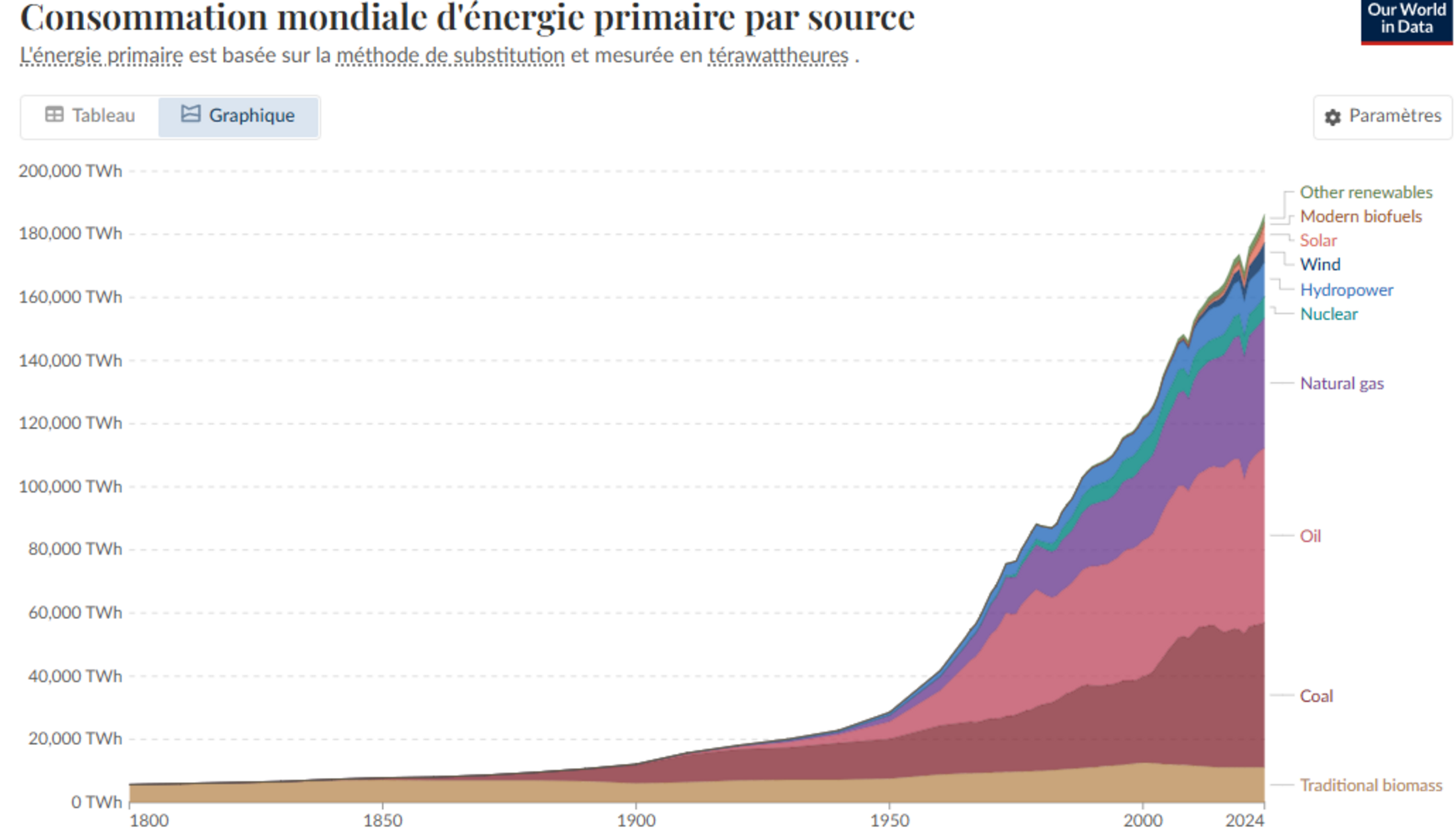 Les énergies fossiles dominent largement le bouquet énergétique primaire mondial, avec une grande stabilité autour de 80 %, depuis plusieurs dizaines d’années ;