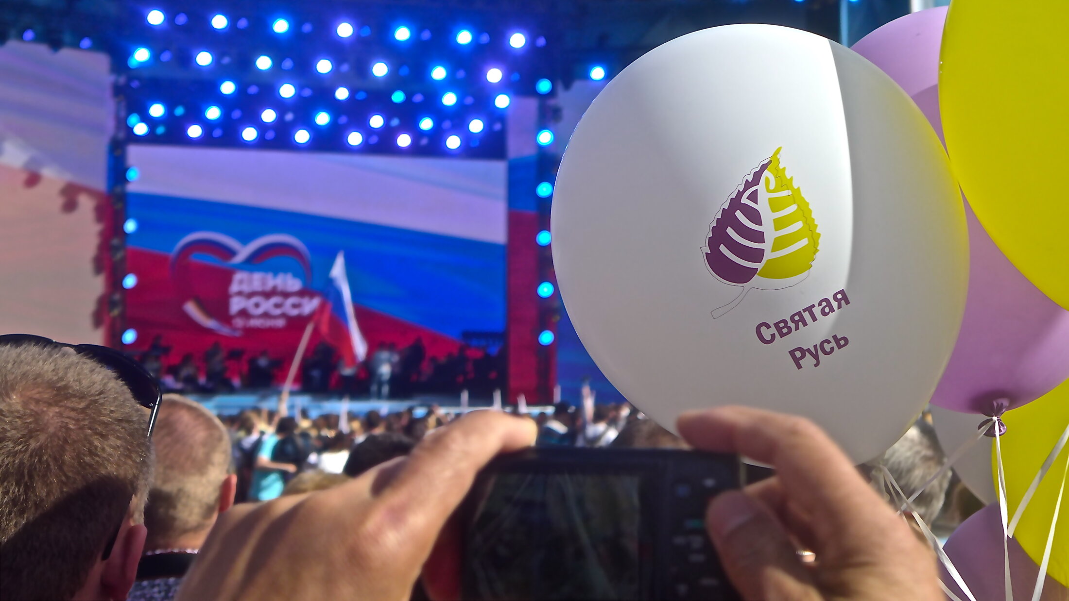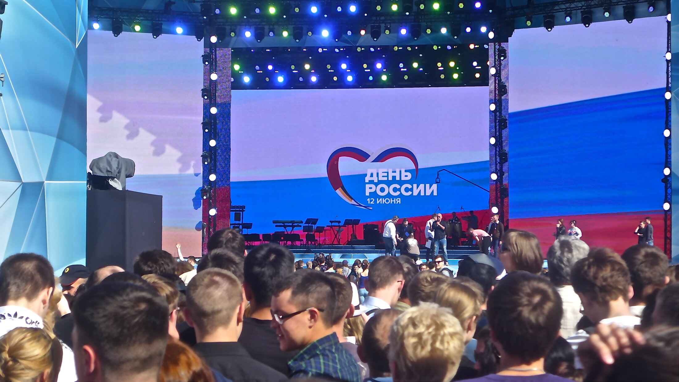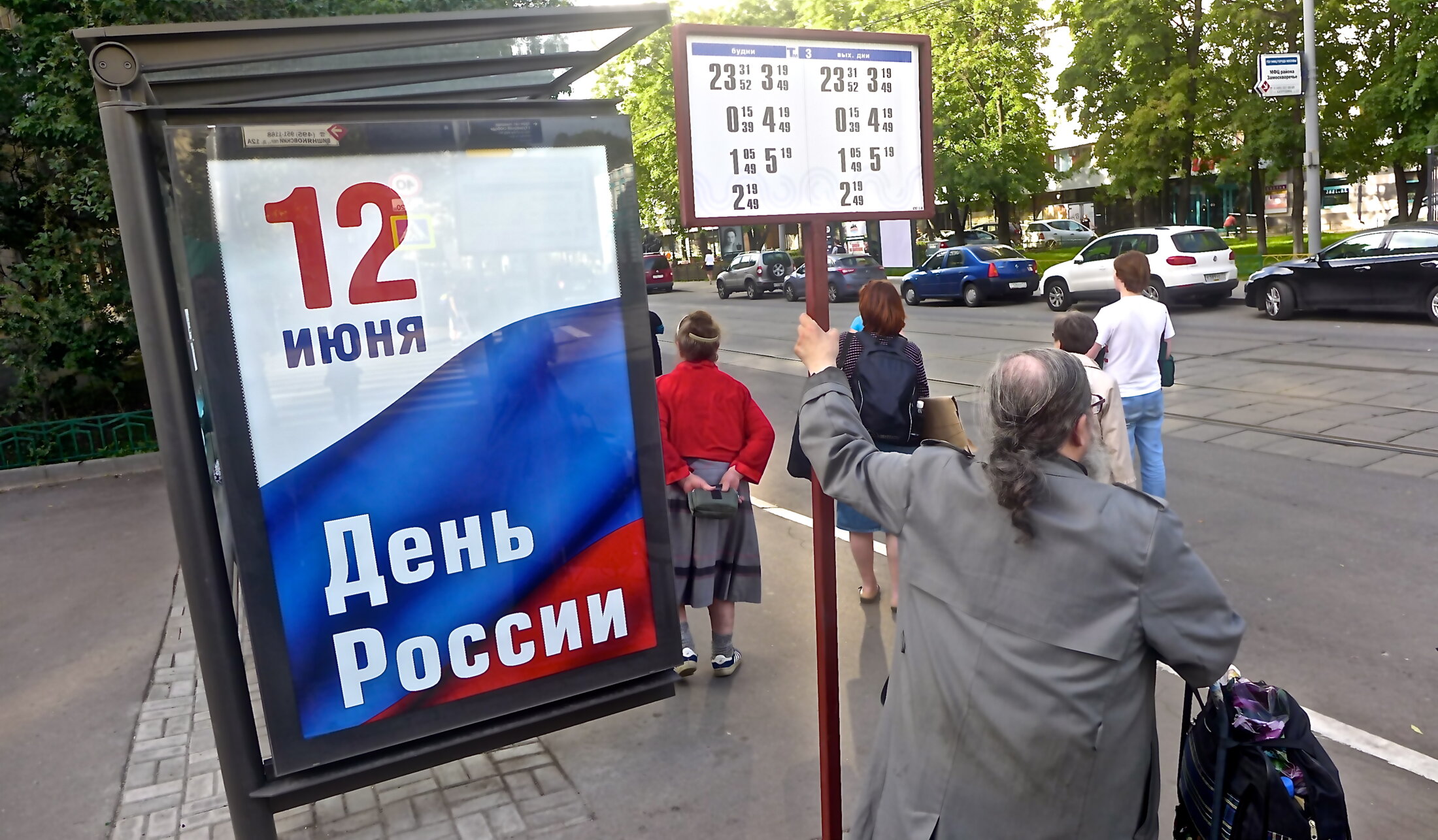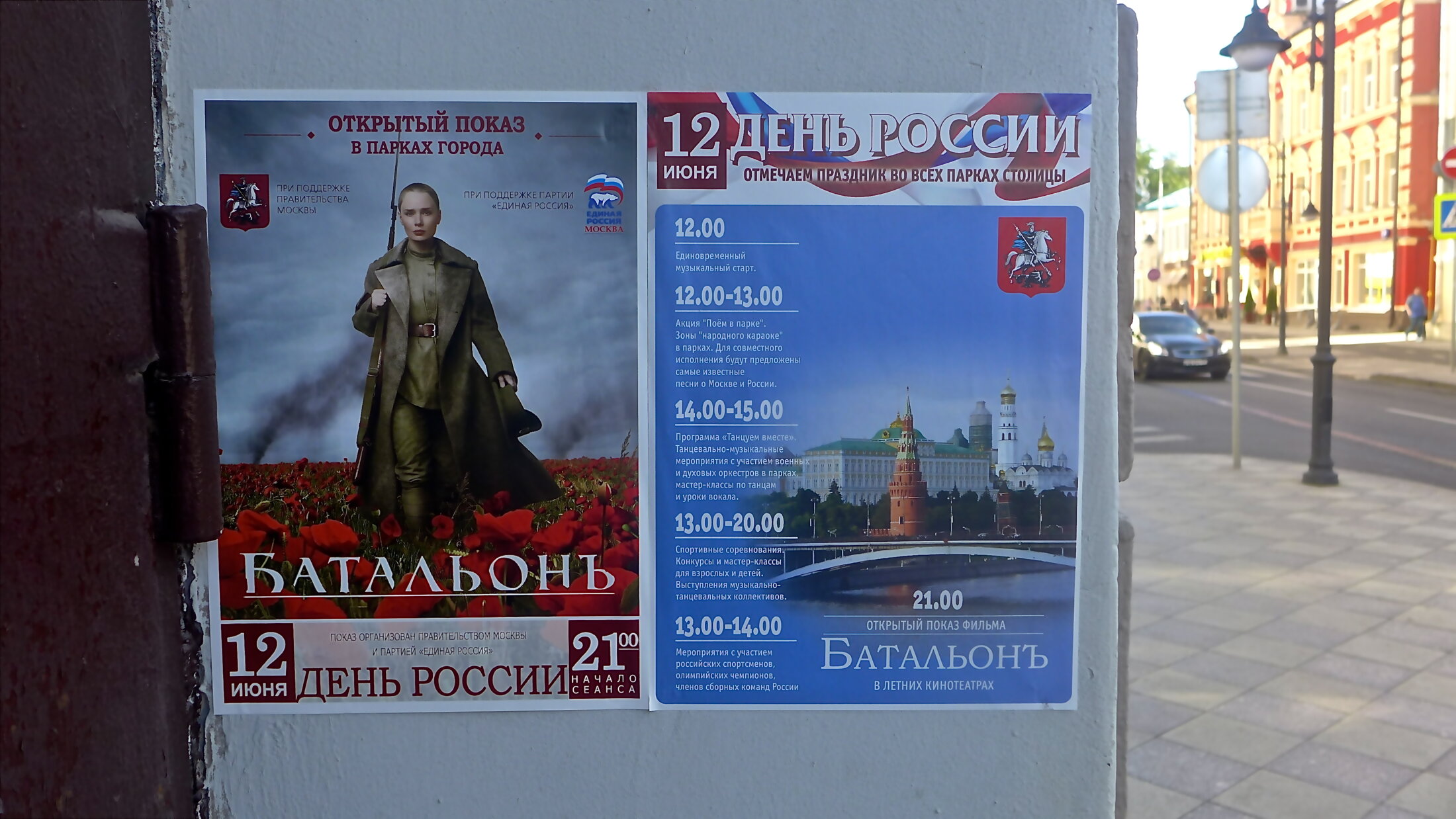 Plus banale, l'affiche officielle du Jour de la Russie sur fond de drapeau russe blanc, bleu, rouge. Cette fête commémore le vote solenel du Parlement russe qui proclama le 12 juin 1990, l'indépendance de la Russie vis-à-vis de l'URSS. Un an plus tard Boris Eltsine est élu président de la Russie, entretemps le Traité de Minsk signé le 8 décembre 1991 entre les présidents des fédérations socialistes soviétiques russe (Boris Eltsine), biélorusse et ukrainienne entérinait la dislocation de l'Union soviétique. Il est ironique de voir les Russes et le premier d'entre-eux Vladimir Poutine fêter un vote et un jour qui a commencé le processus de désintégration de l'URSS, qualifié par ce même Vladimir Poutine le 25 avril 2005, dans une adresse à la Assemblée fédérale, de "plus grande catastrophe géopolitique du siècle".