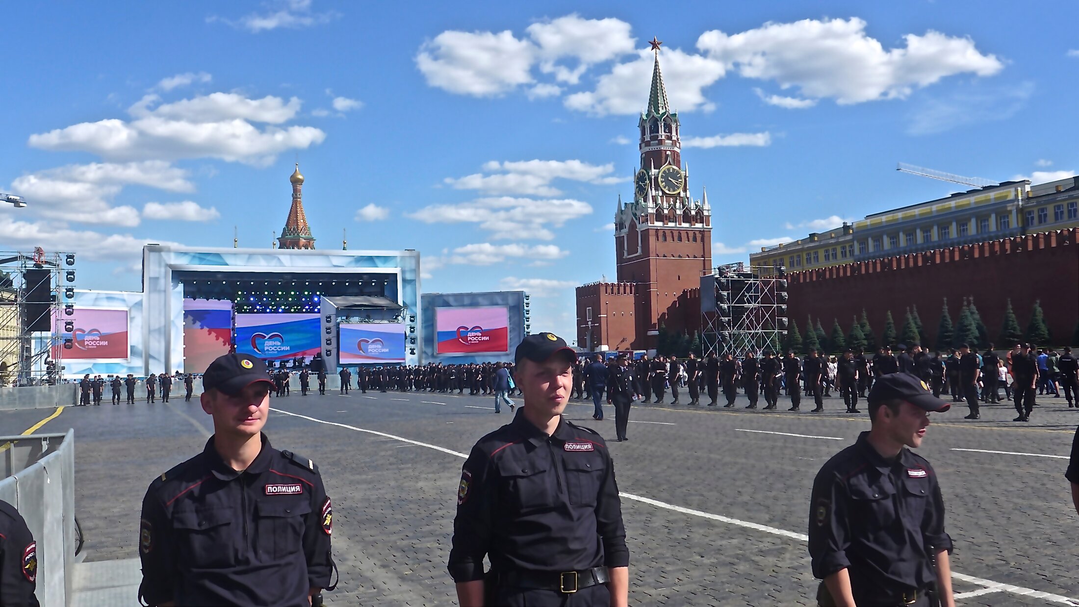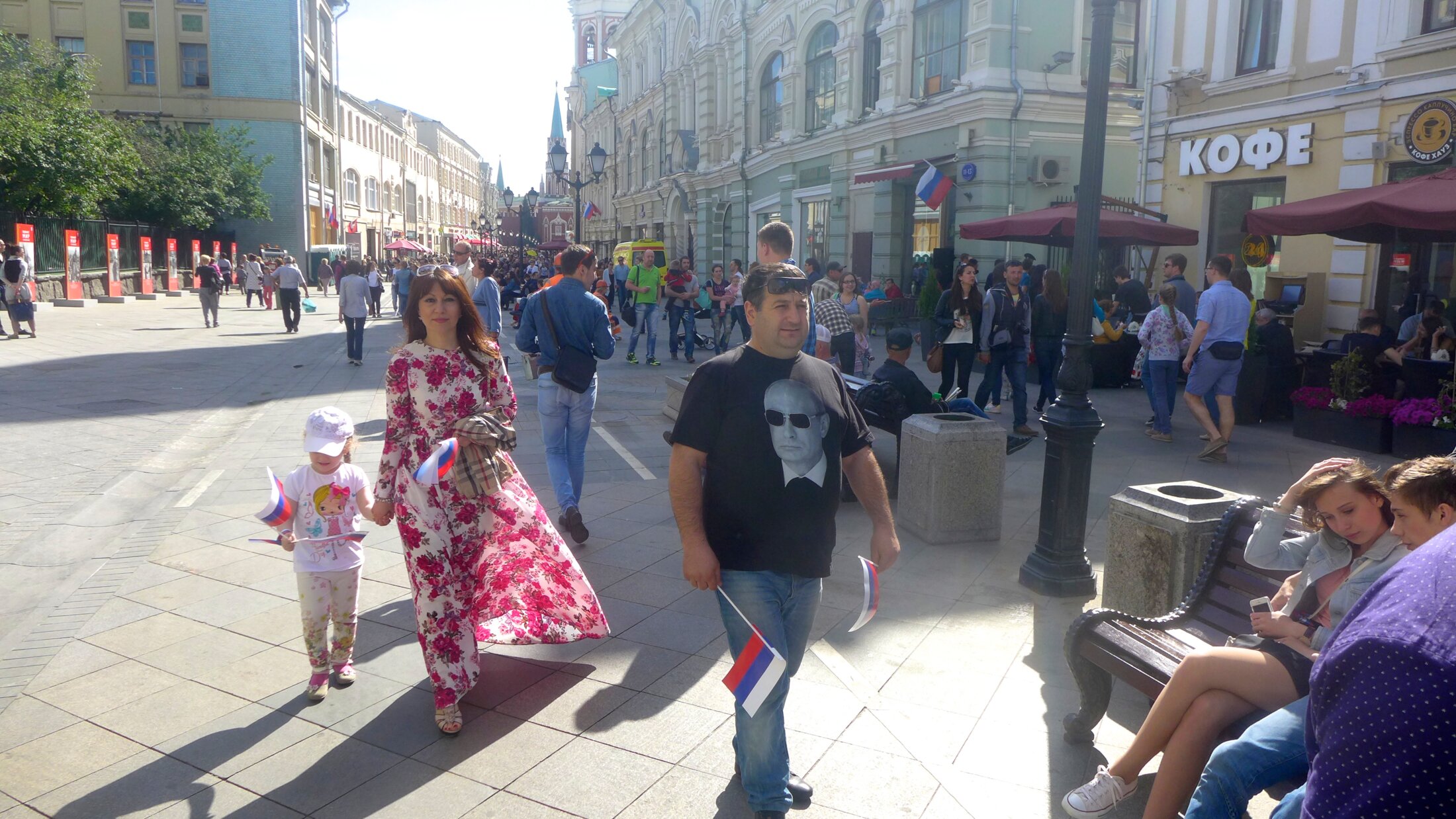 Dans la les rues adjacentes à la Place Rouge, comme ici rue Nikolskaia, des "volontaires" distribuent nombre drapeaux et rubans, cette fois-ci blanc bleu rouge et non plus orange et noir.