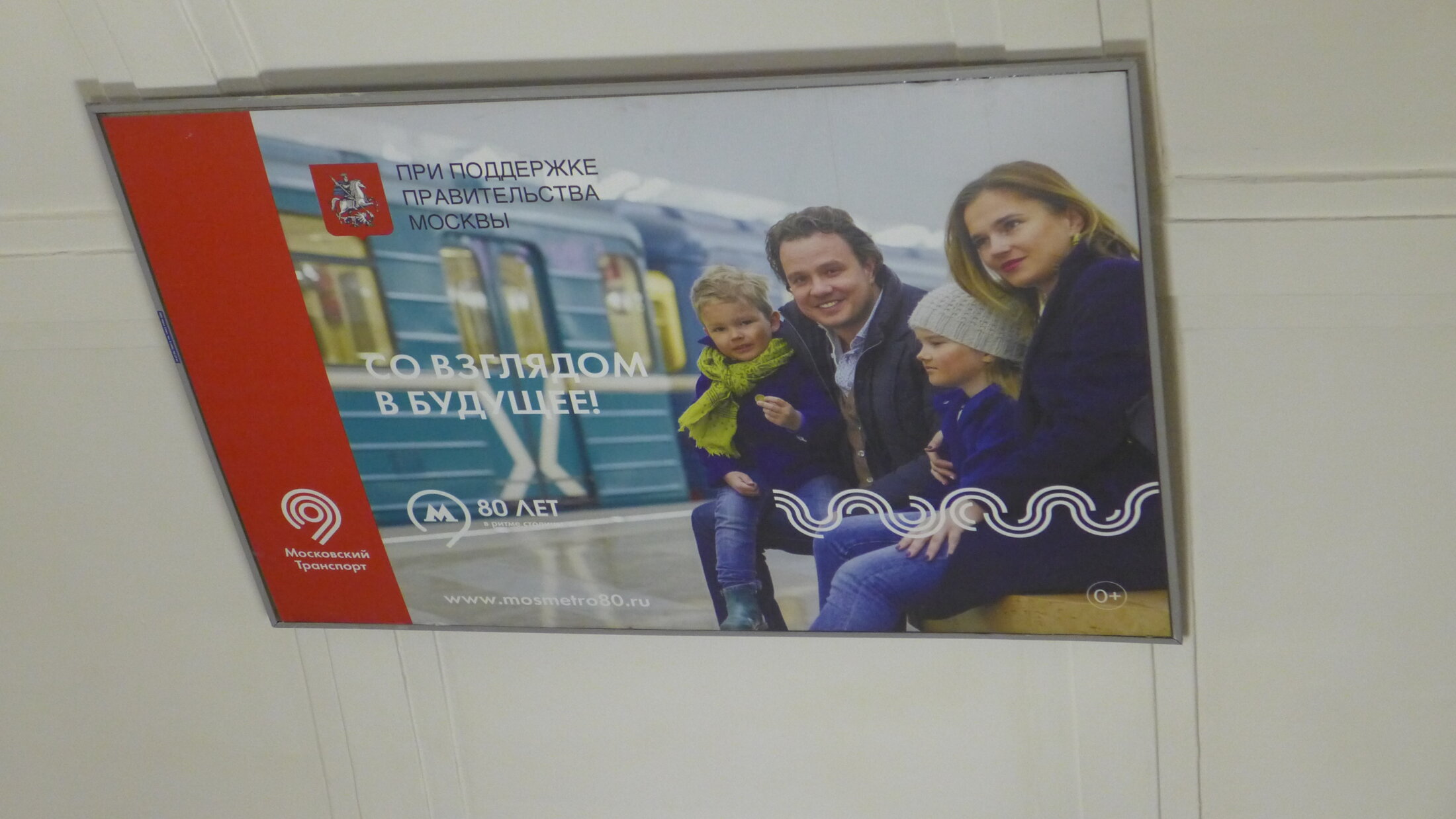 Ce qui est intrigant avec cette image, c'est le contraste entre la rame de métro à l'arrière plan, en service actuellement, bruyante et peu confortable et le slogan "vers le futur". Au premier plan l'image de la famille souriante avec deux enfants n'est pas vraiment une représentation réaliste de l'usager moyen du réseau. Amusant que cette famille ressemble plutôt à la "Kréative klass" qu'à l'électeur moyen de Vladimir Vladimirovitch.