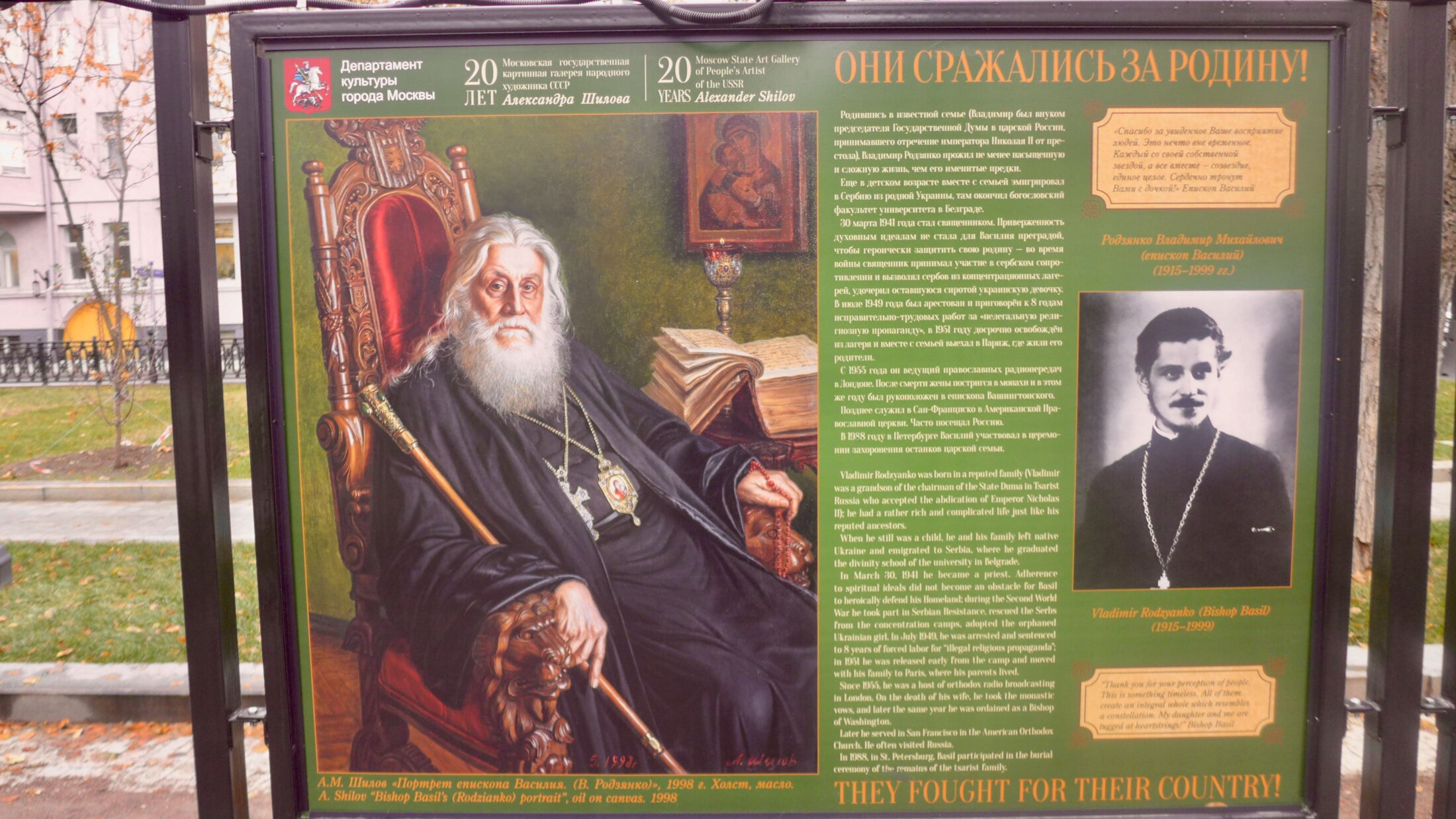 Je m'éloigne rapidement, car il fait quant même un peu froid, pour arriver devant l'agence Tass ( Voir le reportage du 1er février 2017 et la vue aérienne de 2016) et le même scénario des photos mais cette fois-ci de tableaux d'un peintre portrayant d'anciens combattants sur le thème de la Grande Guerre patriotique, le style est très réaliste, se veut poignant mais le traitement est assez pompeux, en tout cas daté. à la fin je comprends qu'il s'agit de Shilov, peintre de cour très patriotique au style réaliste. Retournant sur mes pas je vois des panneaux très intéressants sur la vision qu'il veut donner de la guerre on y voit des prêtres, des religieuses, des paysans, des artistes participant à la défense du territoire et peints dans leur intérieur actuel... Les panneaux sont en anglais et en russe, donc à vision propagandiste intérieure et extérieur et illustre la doctrine actuelle et officielle de la guerre...