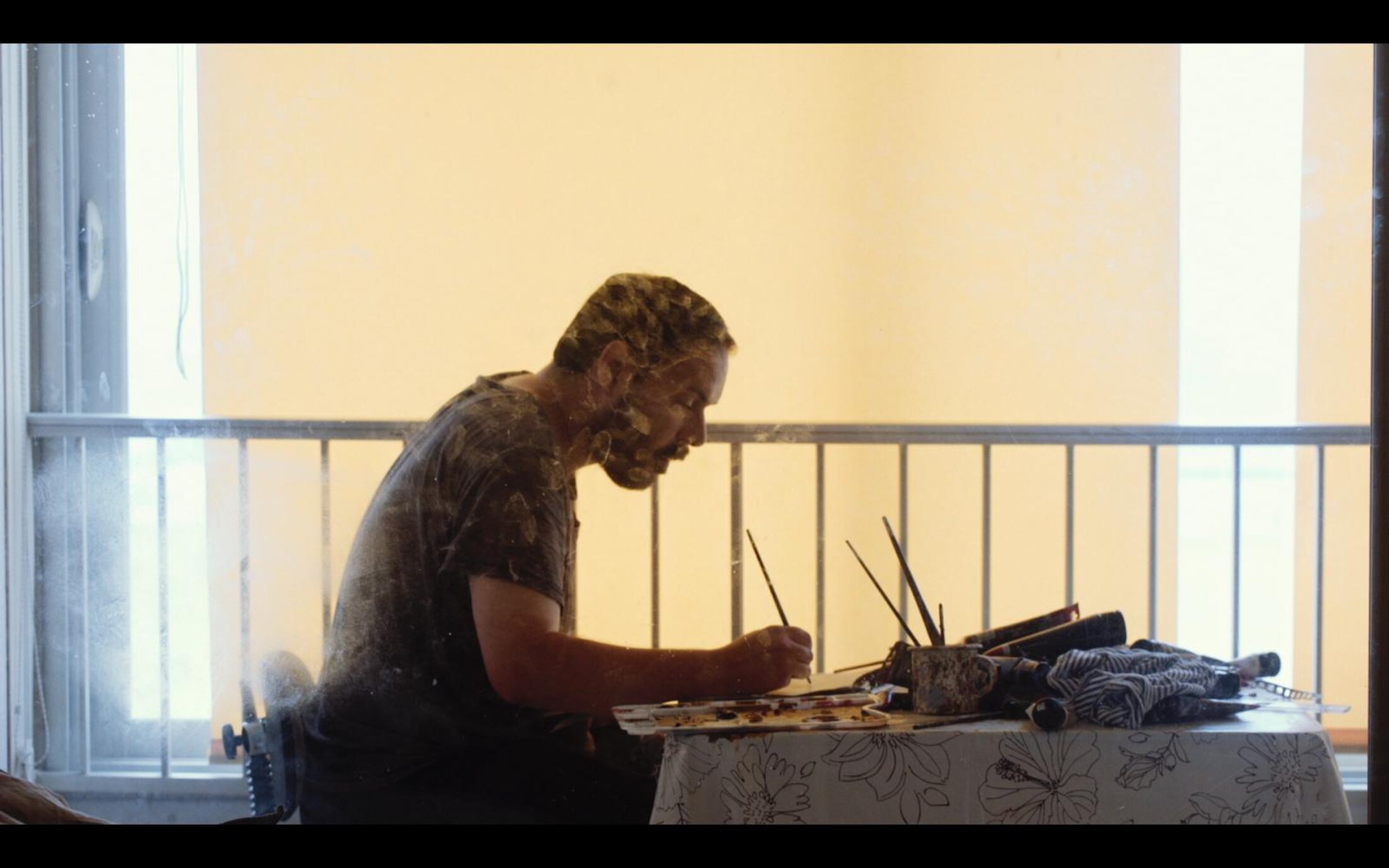 Maxime Garault : Paradoxalement c’était le montage le plus simple que j’ai fait jusqu’à présent. Je l’ai tourné en 2020 et je n’étais pas convaincu. J’ai laissé le film dans un carton et en 2023 j’en ai parlé à une amie qui a demandé à voir des images et m’a dit de le monter. La structure était assez simple, mon inquiétude était surtout qu’il y ait un épuisement et il fallait qu’il y ait quelques variations à l’intérieur du dispositif. Donc, on commence les volets fermés, un espace clos pour recréer un peu l’espace mental de l’hôpital et peu à peu la lumière revient, un mouvement vers l’extérieur. Avec cette progression les tableaux ne pouvaient qu’être dans un certain ordre, il fallait commencer par celui qui se faisait volets fermés, etc... Avec le récit chronologique en voix off et ces peintures le montage était très simple, la question était de déterminer le moment où je coupais pour mettre les déjeuners, ce que j’utilisais comme matière de la peinture, pour faire résonner le travail de Guillaume… et faire coïncider un minimum le récit avec le tableau en cours. Monter mes images a toujours été plus simple pour moi parce que je n’ai pas peur d'abîmer le travail de quelqu’un d’autre. Et comme je l’ai commencé seul il n’y avait pas d'attente autour de ce film donc j’avais beaucoup de liberté.