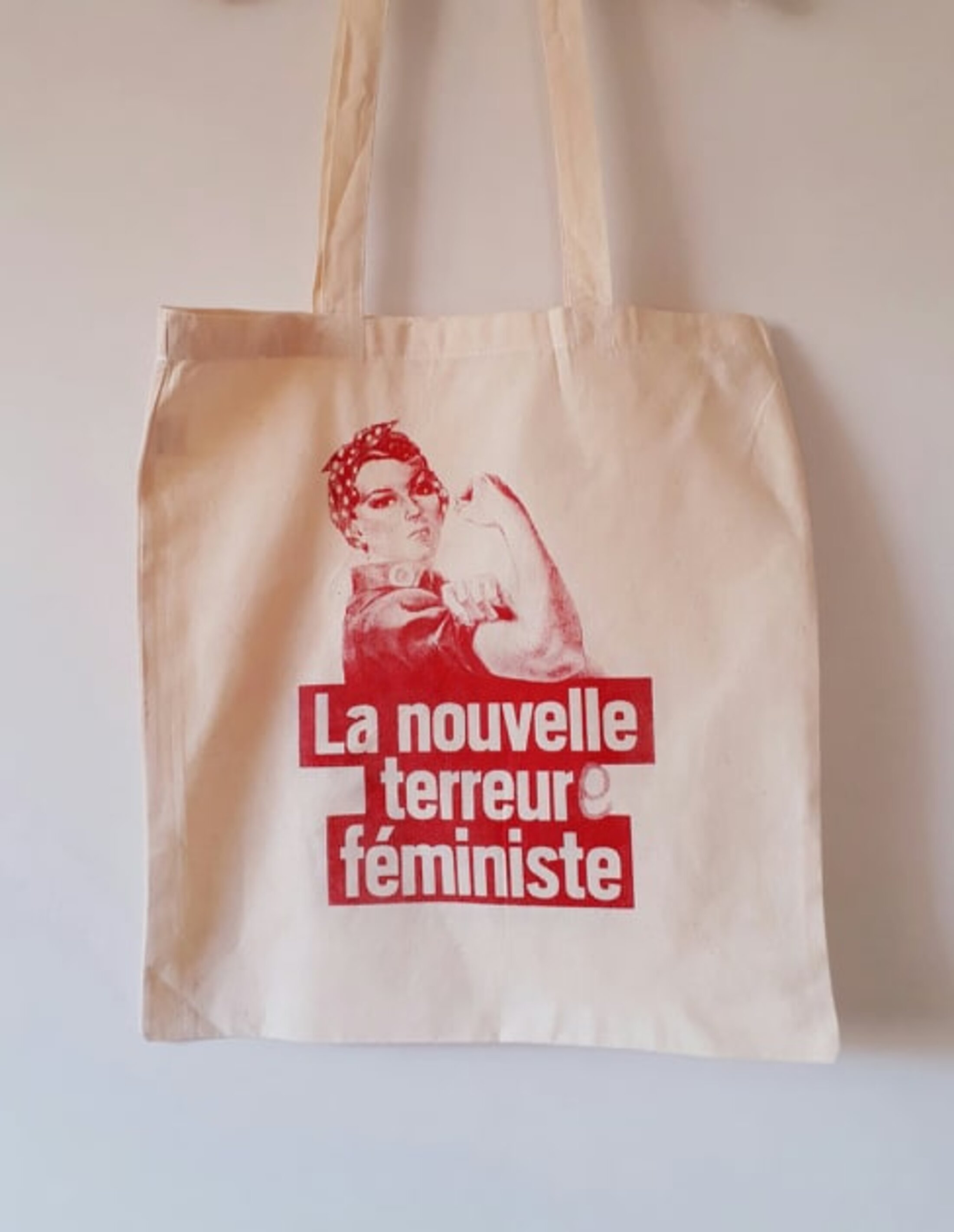 Une blague si grotesque que nous avons décidé de nous amuser de leur bêtise. Si ce journal se permet de voler un symbole de force et de liberté alors, nous, féministes, avons décidé de remettre à l'honneur le portrait de Rosie. Et c'est avec un immense plaisir que nous dédions le jolie E (que nous avons ajouté au mot « terreurE »), à Valeurs actuelles ! Un tote bag qui fait peur ! Un détournement de leur une pour rappeler la nécessité du combat de toutes les féministes.