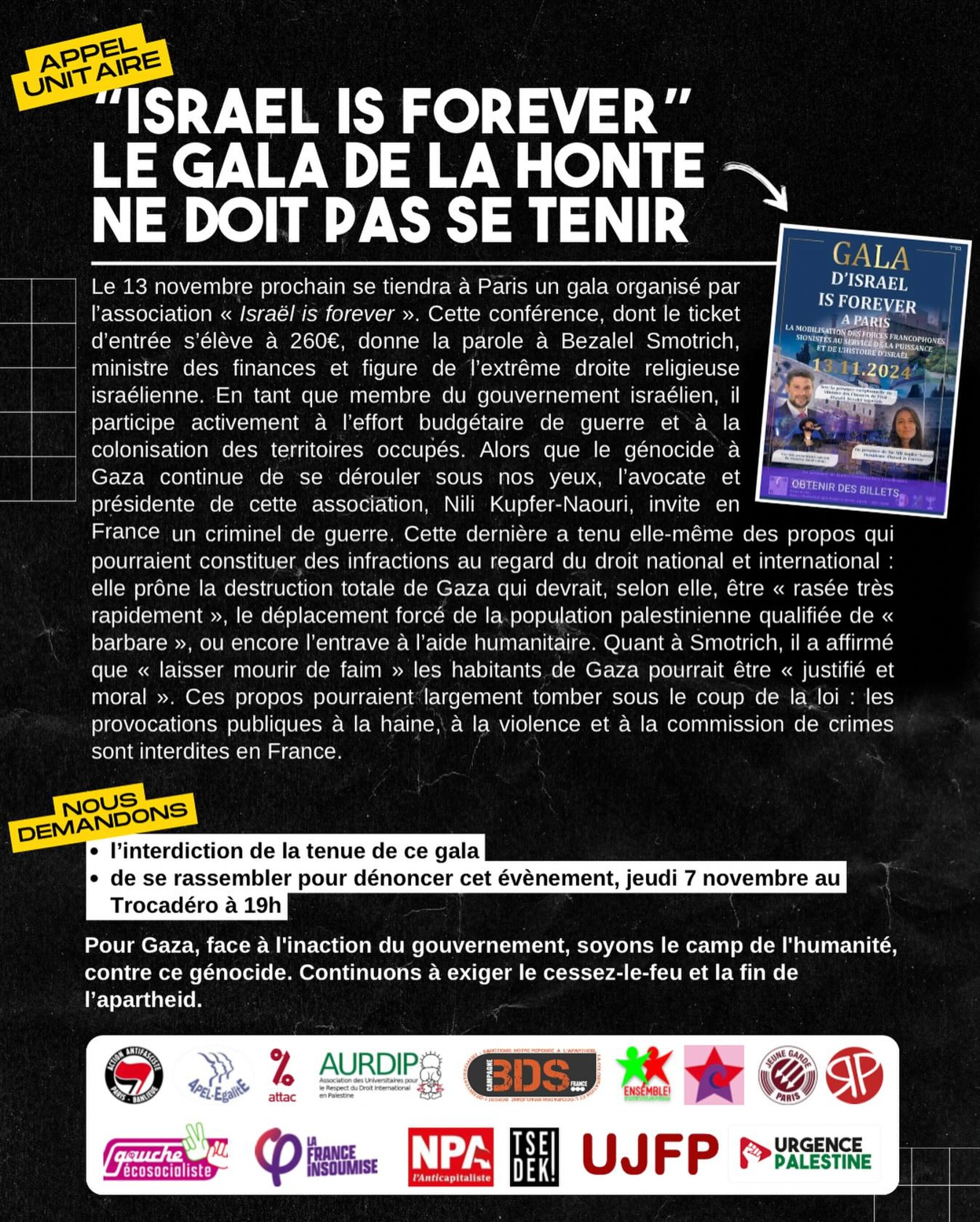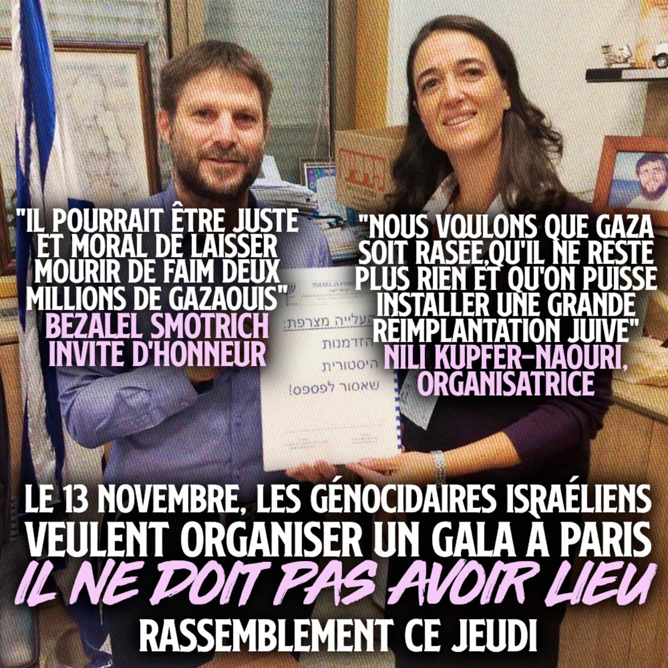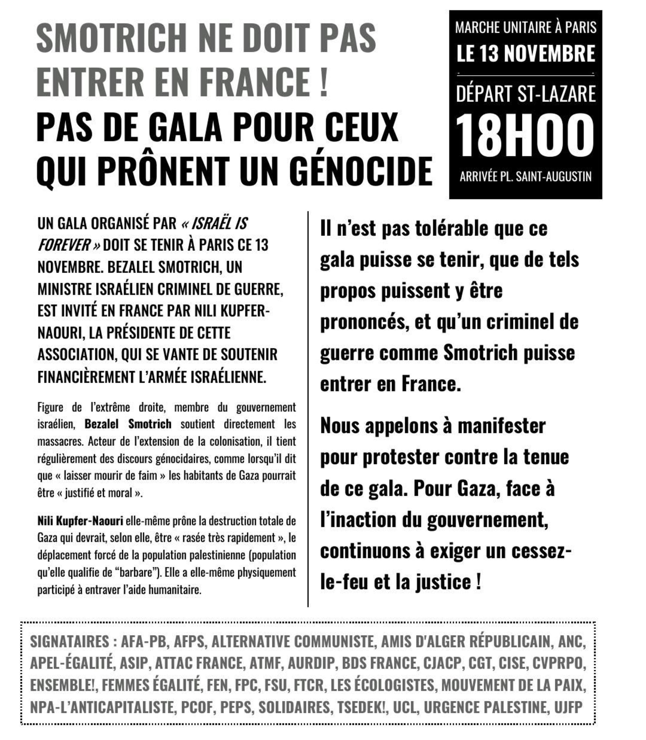 Alors que le gouvernement israélien exécute un génocide à Gaza, je demande au préfet de police de Paris d’interdire le « Gala d’Israel is Forever », prévu à Paris le 13 novembre en présence du ministre israélien des Finances, Bezalel Smotrich qui trouve moral de laisser mourrir… pic.twitter.com/eNySTU12HX