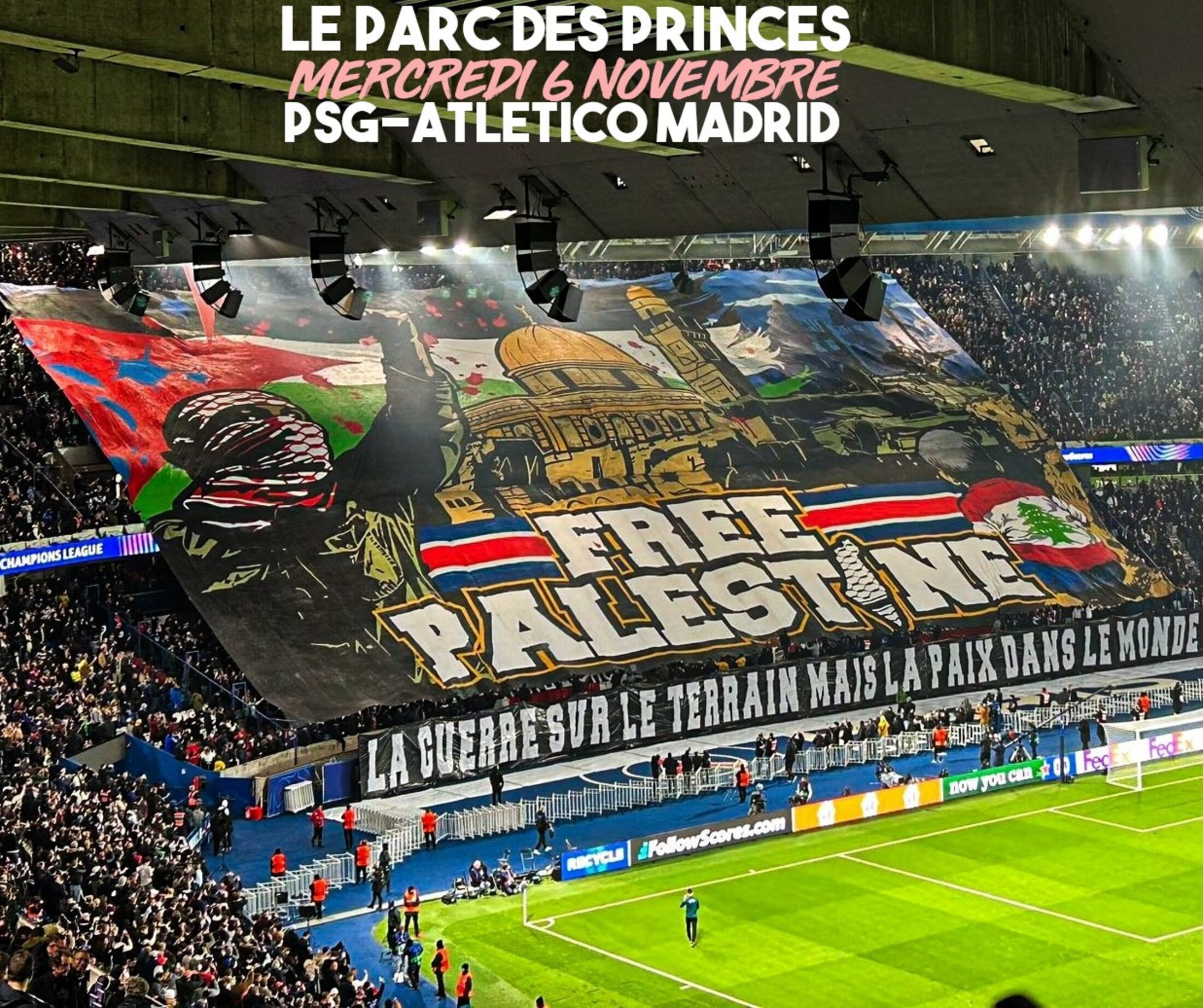 « Avant Paris SG-Atlético Madrid, qui s’est soldé mercredi soir par une défaite 2-1 des Parisiens, le Collectif ultras Paris (CUP) a déroulé un tifo avec le message "Free Palestine". »