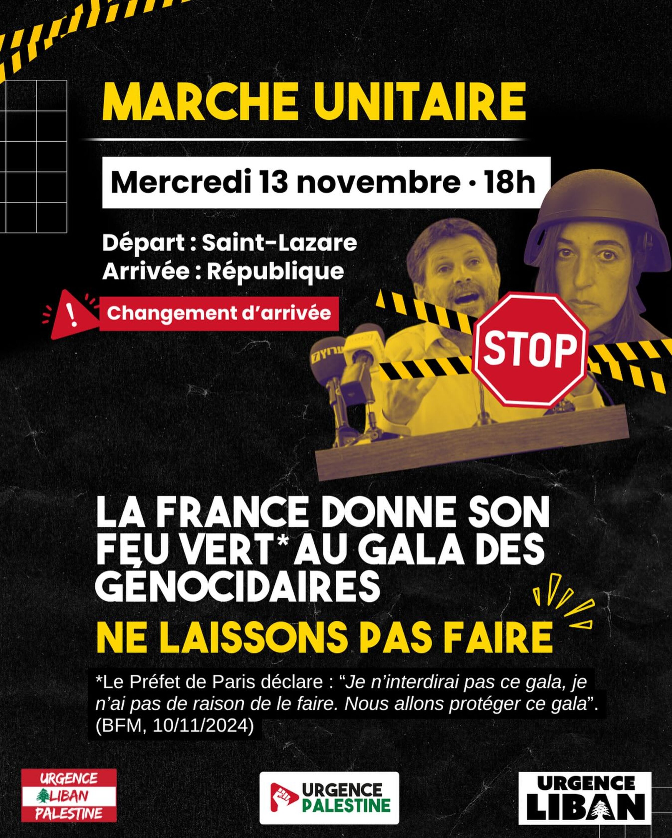 De nombreuses organisations appellent à se mobiliser et à se réunir à nouveau le 13 novembre, le soir même du gala, pour une marche de protestation contre cet événement. Dès le 11 novembre, Urgence Palestine a lancé un appel à se rassembler le 13 novembre à 18h00 à Saint-Lazare, un appel relayé par BDS France. Le 12 novembre, d'autres organisations se joignent à l'appel. Dans son interview à BFM, le préfet a déclaré qu'il n'interdirait pas la manifestation prévue contre ce gala, mais qu'elle se tiendrait dans un lieu éloigné de l'évènement.