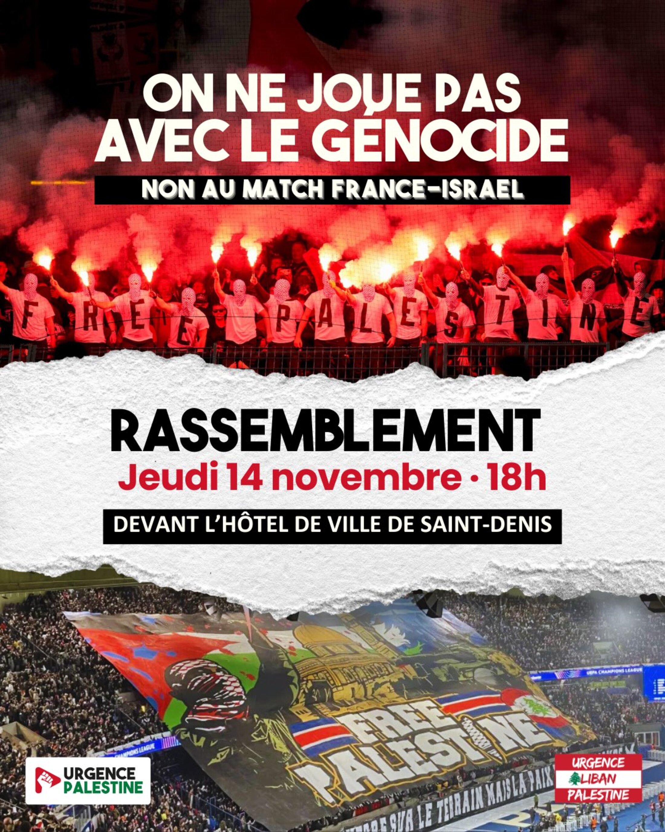 Le même jour, l'International Solidarity Movement relaye l'appel d'Urgence Palestine pour un rassemblement devant la mairie de Saint-Denis à 18h00, le 14 novembre, contre la tenue du match France-Israël.
