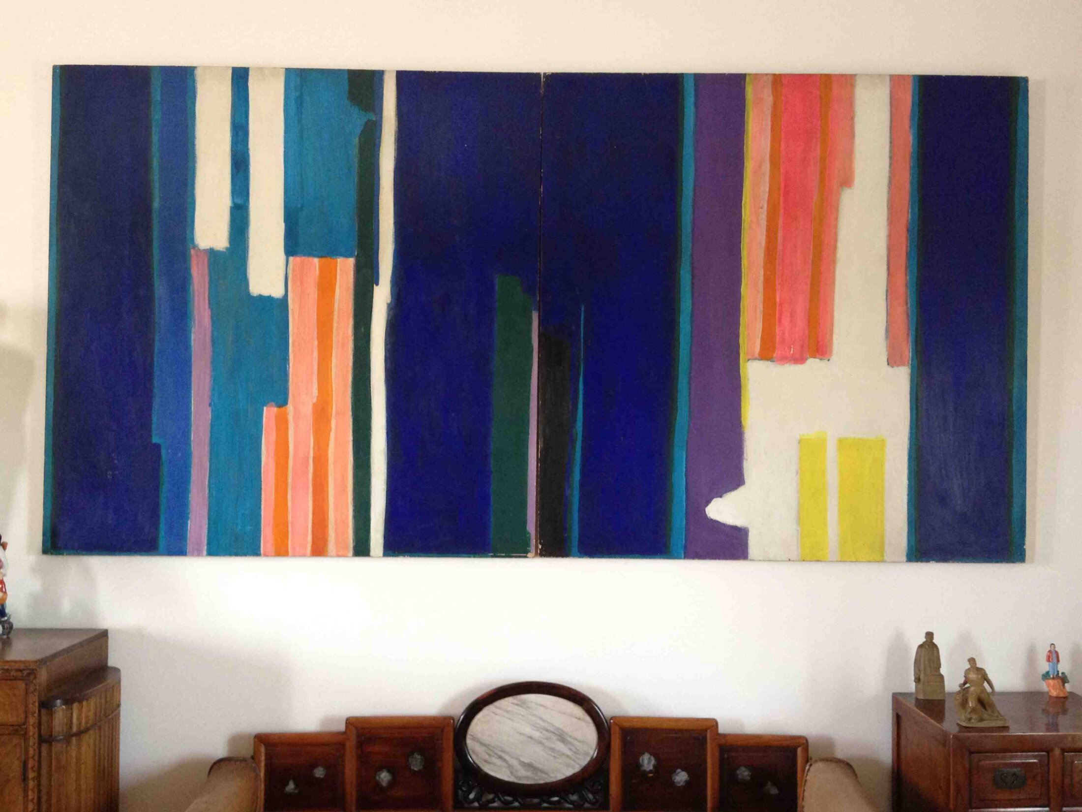 Ensemble, nous avons arrimé le diptyque sur mon vieux cabriolet 403 décapoté. Dans un premier temps, le grand tableau allait trôner dans un petit deux-pièces de la Résidence Universitaire d’Antony avant de connaître, pendant très exactement cinquante ans, certaines pérégrinations.