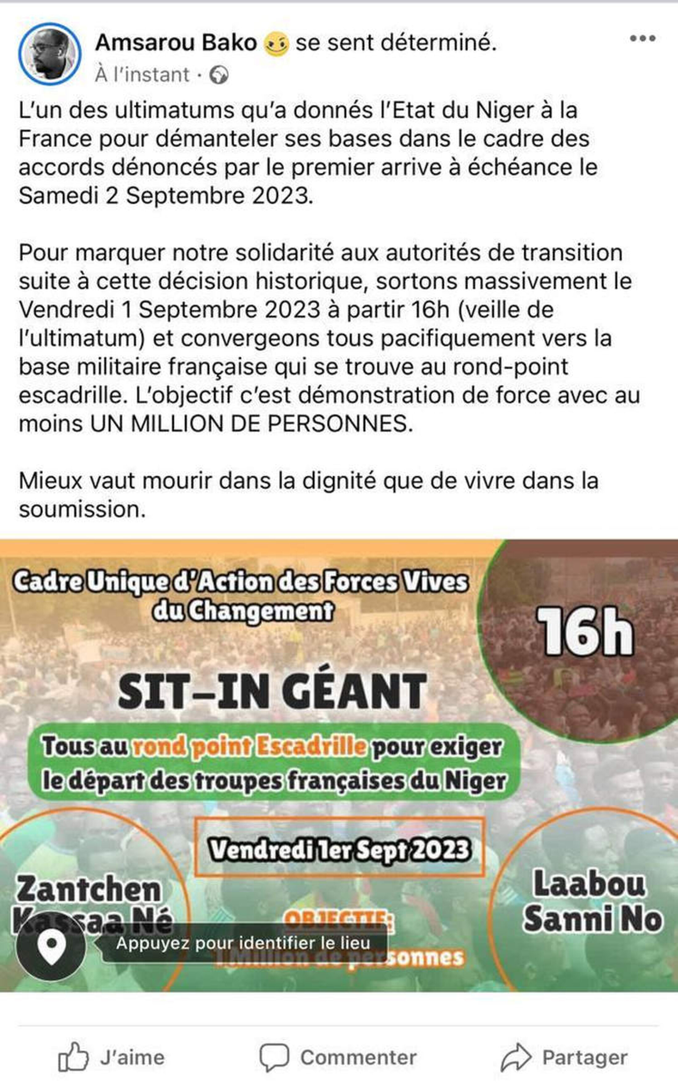 la légitimité du nouveau pouvoir manifestement acceptée par la population. Il doit faire confiance à sa volonté affichée d'opérer dans le délai qu'il juge nécessaire une transition vers une démocratie nouvelle. Il doit considérer la volonté pacifique qui se manifeste aujourd'hui dans cet appel à ce sit in, volonté qui contraste avec les menaces belliqueuses d'une CEDEAO qu'il soutient à bout de bras et de la France elle-même dont les troupes font figure désormais de troupes d'occupation.
