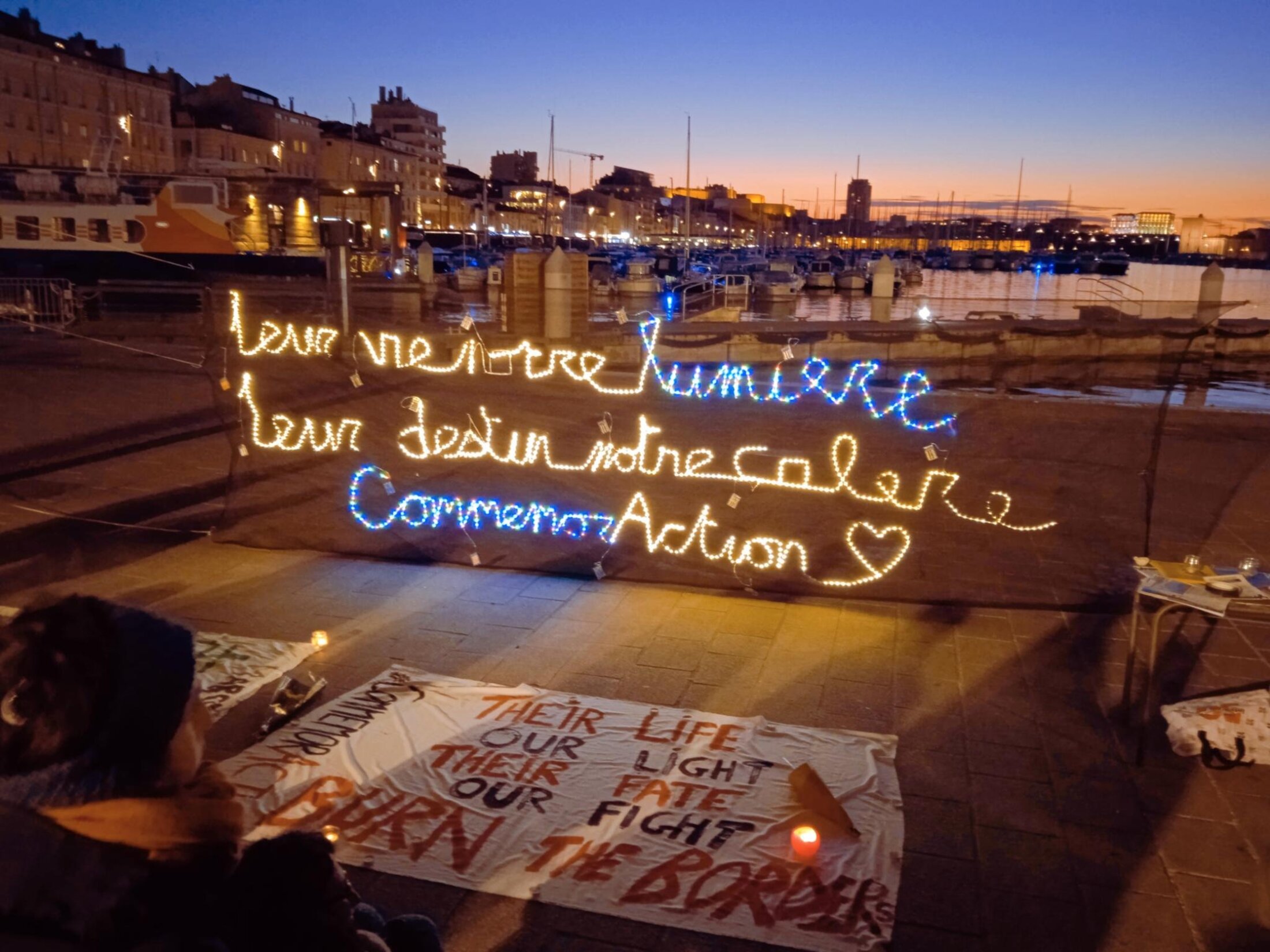 A Marseille, en ce 6 février 2023, de nombreuses personnes se sont retrouvées et rencontrées sous l'ombrière du vieux port en début de soirée afin de visibiliser et rendre hommage. Les mots sont difficiles à trouver pour résumer ces quelques heures partagées ensemble mais elles étaient puissantes et importantes. Merci à toutes les personnes qui se sont exprimées. Merci d'avoir parlé de ce qu'il se passe aux portes de nos frontières internes (en France et notamment avec la nouvelle loi contre l'immigration de Darmanin qui va précariser et diviser davantage les personnes en situation d'exile en France, les situations entre l'Italie et la France, entre la France et le Royaume Uni) mais aussi aux portes de l'Europe, sur la route des Balkans, en Méditerranée et bien au delà entre les Etats Unis et le Mexique notamment. . Merci d'avoir abordé la question de l'externalisation des frontières, du fait que les crimes et la répression des états européens commencent déjà bien au Sud, au Sahel, au Niger, en Lybie, au Maroc, en Tunisie et font là aussi de nombreuses victimes et injustices. Merci d'avoir rappelé que les Etats Européens sont responsables et coupables, notamment à l'aide de Frontex, organe assez opaque et pourtant étant celui recevant le + d'argent des pays européens (budget 2022: 704 703 142 d'euros. 2021: 499 610 042 d'euros) ( voir campagne Abolish Frontex). Merci aux personnes qui se sont exprimées pour parler de leurs expériences sur diverses routes migratoires pour arriver jusqu'ici, des personnes laissées en chemin, des milliers de kilomètres parcourus, parfois à pieds pour arriver jusqu'ici et faire face à cet accueil, ou plutôt trop souvent ce non-accueil, honteux. Et merci à toutes les personnes qui n'ont pas pu s'exprimer mais que nos coeurs ont honorées, pour lesquelles nos pensées se sont unies et ont rendu hommage à leur silence subi.
