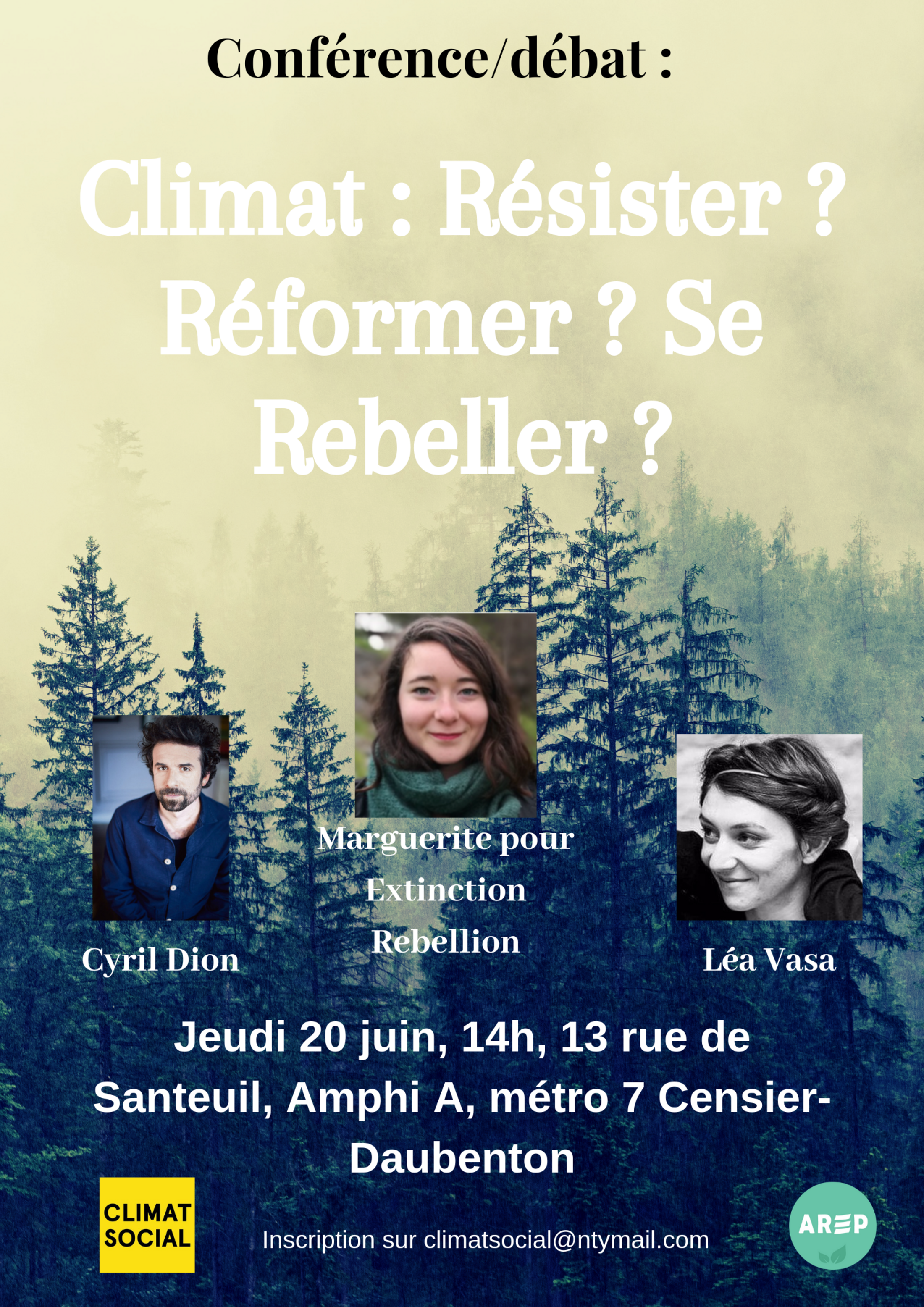 RDV Jeudi 20 juin, 14h, à Paris, 13 rue de Santeuil, Amphithéâtre A, Sorbonne-Nouvelle, métro 7 Censier-Daubenton, pour la nouvelle conférence de Climat Social co-organisée avec l'AREP Climat : réformer ? résister ? se rebeller ? Avec Cyril Dion, Extinction Rebellion et Léa Vasa