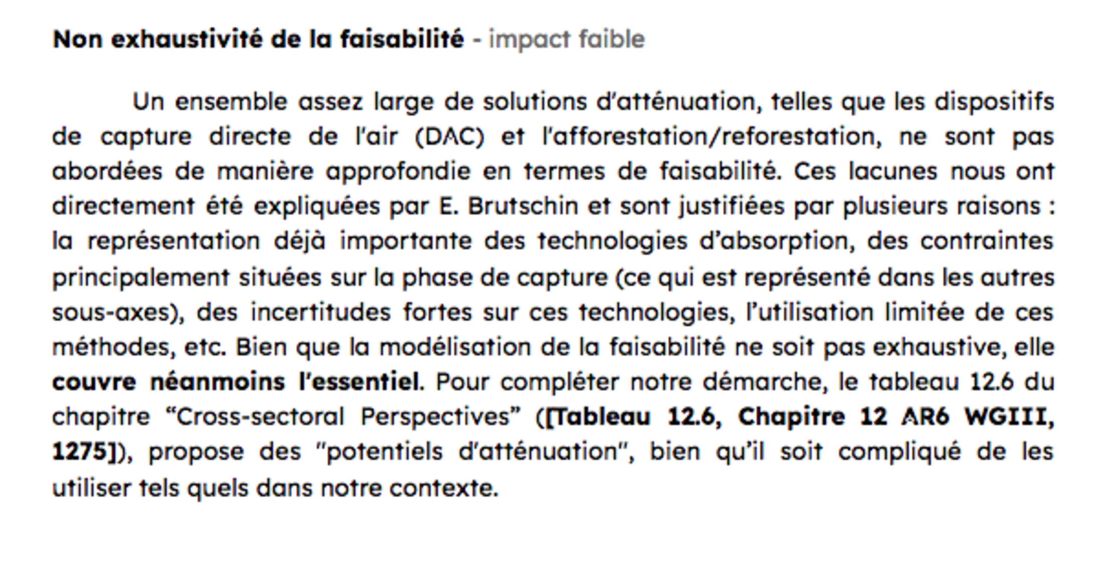 Un peu plus loin dans la même note le fait de ne pas vraiment évaluer la faisabilité de la CDR requise — et dont on voit pourtant ci-dessus l'impact énorme sur les scénarios et les objectifs retenus — était certes présenté comme une limite de « l'étude »... mais une limite à l'impact faible, n'entraînant soi-disant qu'une « variation négligeable en ordre de grandeur et/ou [n'ayant] pas d'influence sur sa signification et la pertinence des interprétations du résultat » [23].