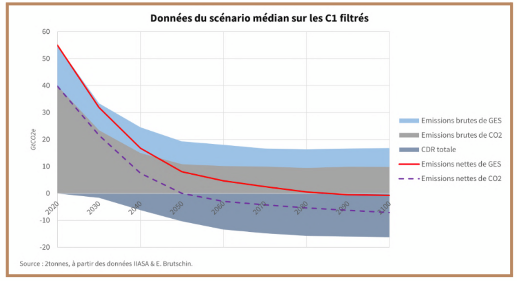 Une sorte de « mensonge » qui s'épaissit encore quand on reprend comme le fait l'entrepreneur, alors qu'on veut s'adresser avant tout à un public néophyte, une terminologie qui parle de scénarios « sans dépassement » — de température — alors qu'on table massivement sur la CDR plutôt que sur l'atténuation des émissions pour ne pas dépasser le seuil en question.