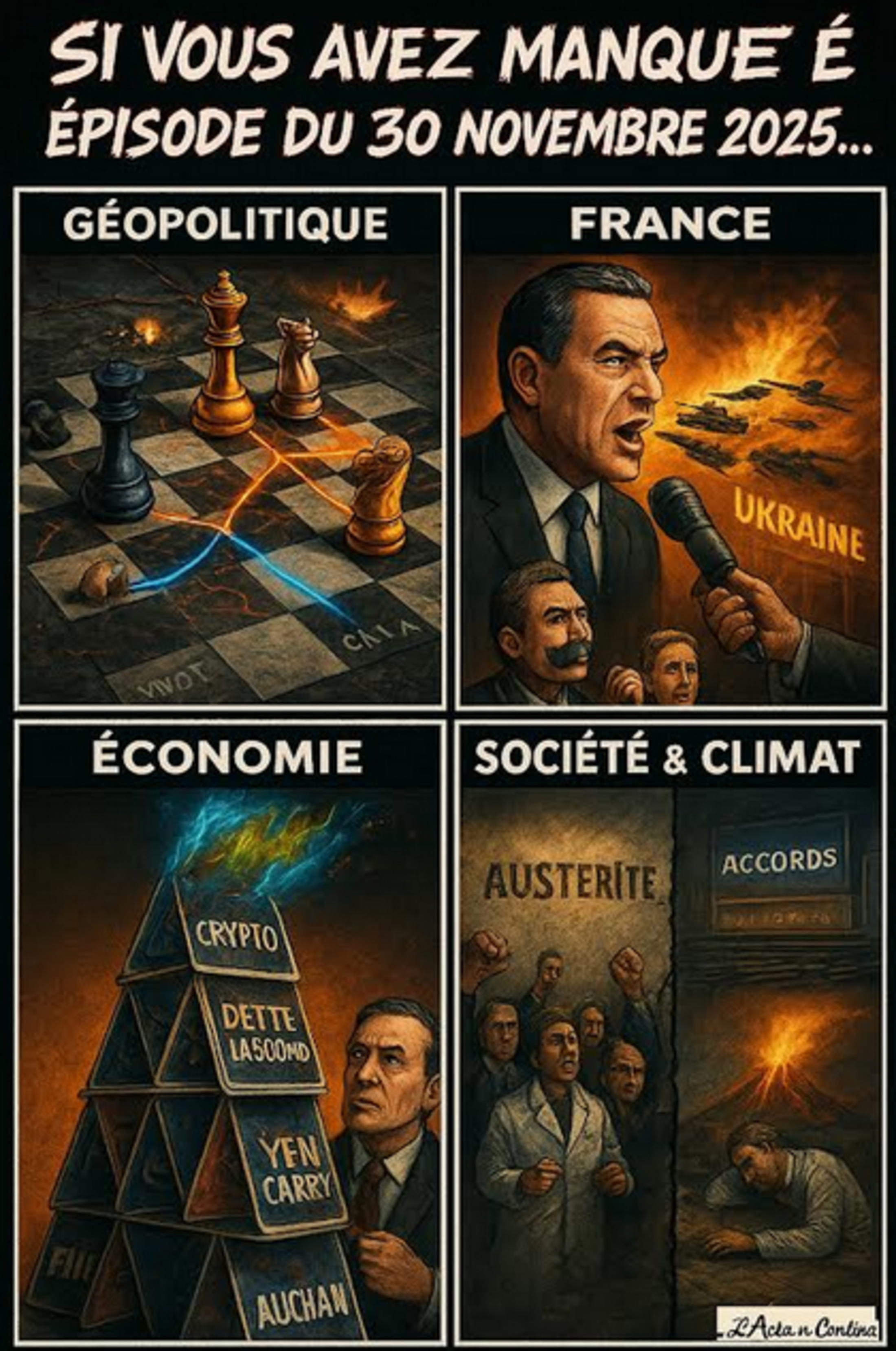 Sur le plan économique, les signaux d'effondrement se confirment. Les stablecoins menacent de déclencher un krach obligataire selon la BIS, pendant que « l'architecture cachée de la révolution de la dette IA » révèle 500 milliards de dollars de financement hors bilan qui redessinent l'Amérique corporative. Le Japon s'inquiète d'un possible « Yen Carry Singularity » à 50 trillions de dollars, tandis que la France voit Auchan basculer 300 supermarchés sous bannière Intermarché et Netto (11 000 salariés concernés). Fnac Darty pourrait passer sous contrôle chinois. Les crypto-actifs plongent, confirmant les alertes sur une bulle spéculative monumentale. « Cinq idées dominantes en économie totalement invalidées par les faits » résume la faillite intellectuelle du néolibéralisme.