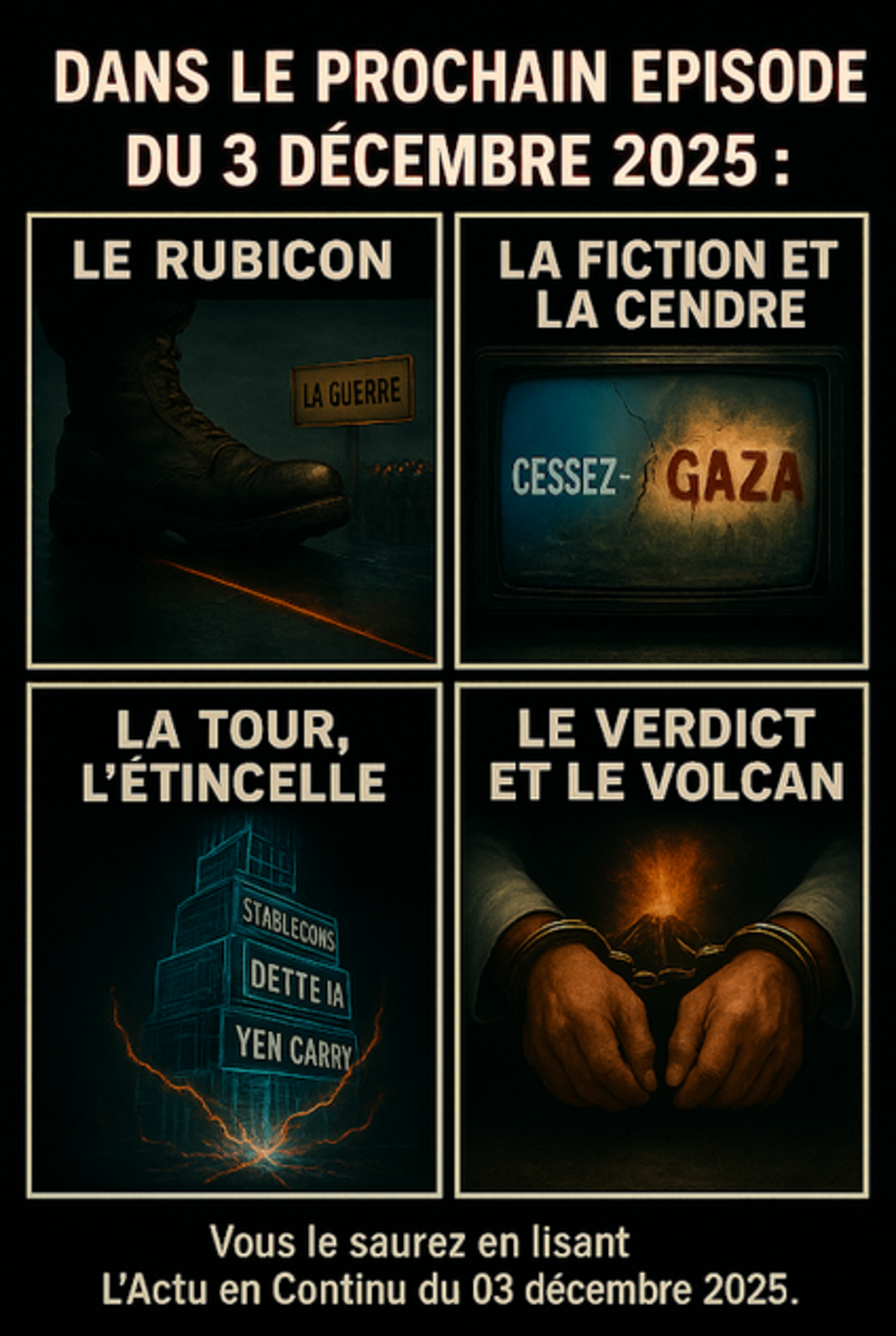 La BIS a tiré la sonnette d'alarme sur les stablecoins (cryptos adossées au dollar) qui pourraient provoquer un krach des obligations d'État. Parallèlement, les 500 milliards de dollars de dette IA hors bilan révélés cette semaine créent les conditions d'un effondrement en cascade — exactement le scénario de 2008. Le Japon vacille sous le poids du « Yen Carry Singularity » (50 trillions de dollars d'unwinding). Les marchés tiennent-ils encore ou sommes-nous à quelques jours d'un krach systémique ? Auchan vient de sacrifier 11 000 salariés : combien d'autres plans sociaux massifs cette semaine dans la grande distribution, l'industrie, la tech ? L'effondrement de la bulle IA est-il en train de se produire sous nos yeux ?