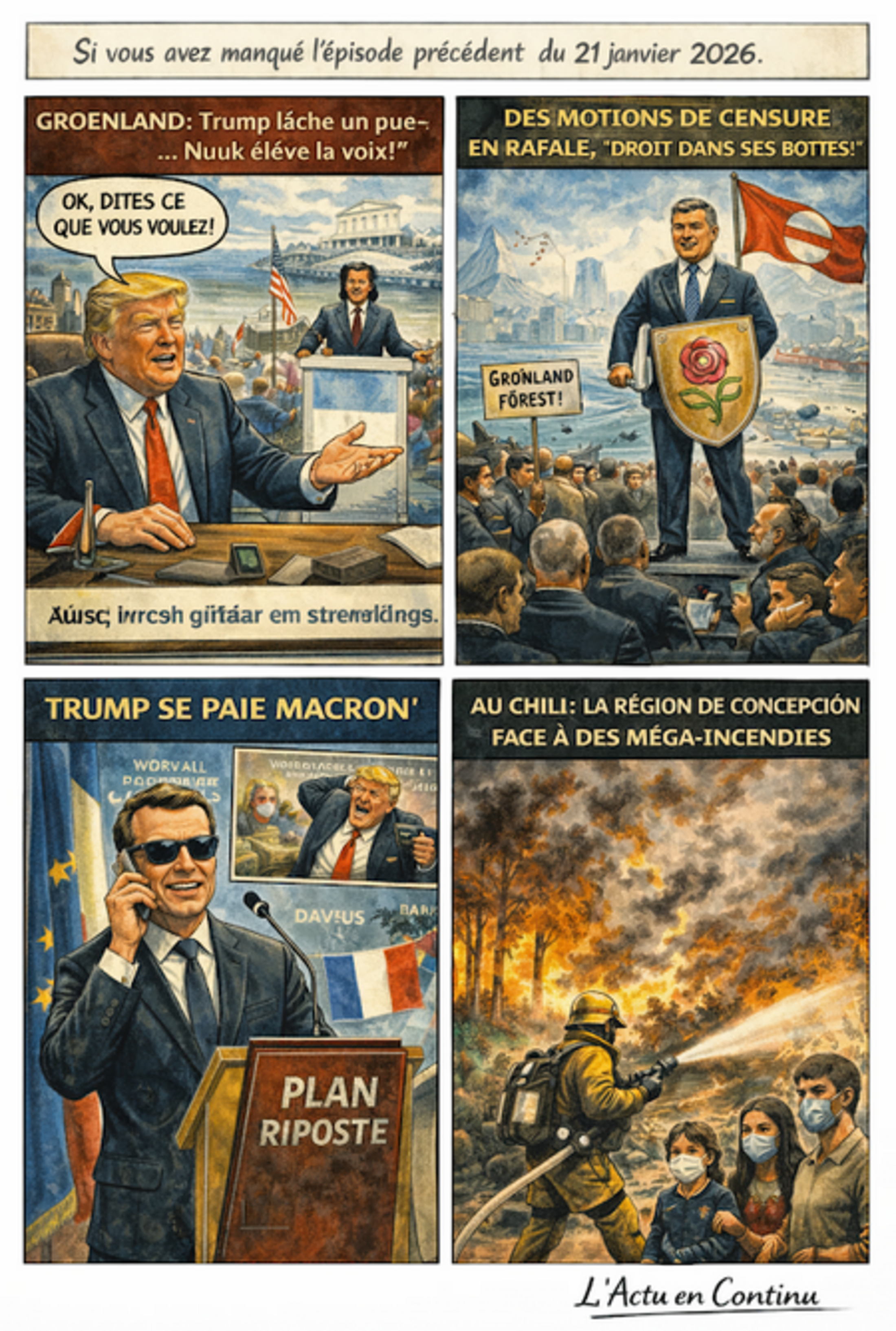 L'Europe mène un bras de fer contre Trump sur le Groenland. L'Arctique devient le nouvel espace de conquête avec la fonte des glaces comme enjeu géostratégique majeur. La prétendue menace russe au Groenland suscite l'ironie, l'étonnement et la contestation de Moscou. Le Canada à Davos réitère son soutien "ferme" au Groenland et au Danemark. Les visées américaines sur le territoire sont directement liées aux changements climatiques qui ouvrent de nouvelles routes et ressources.