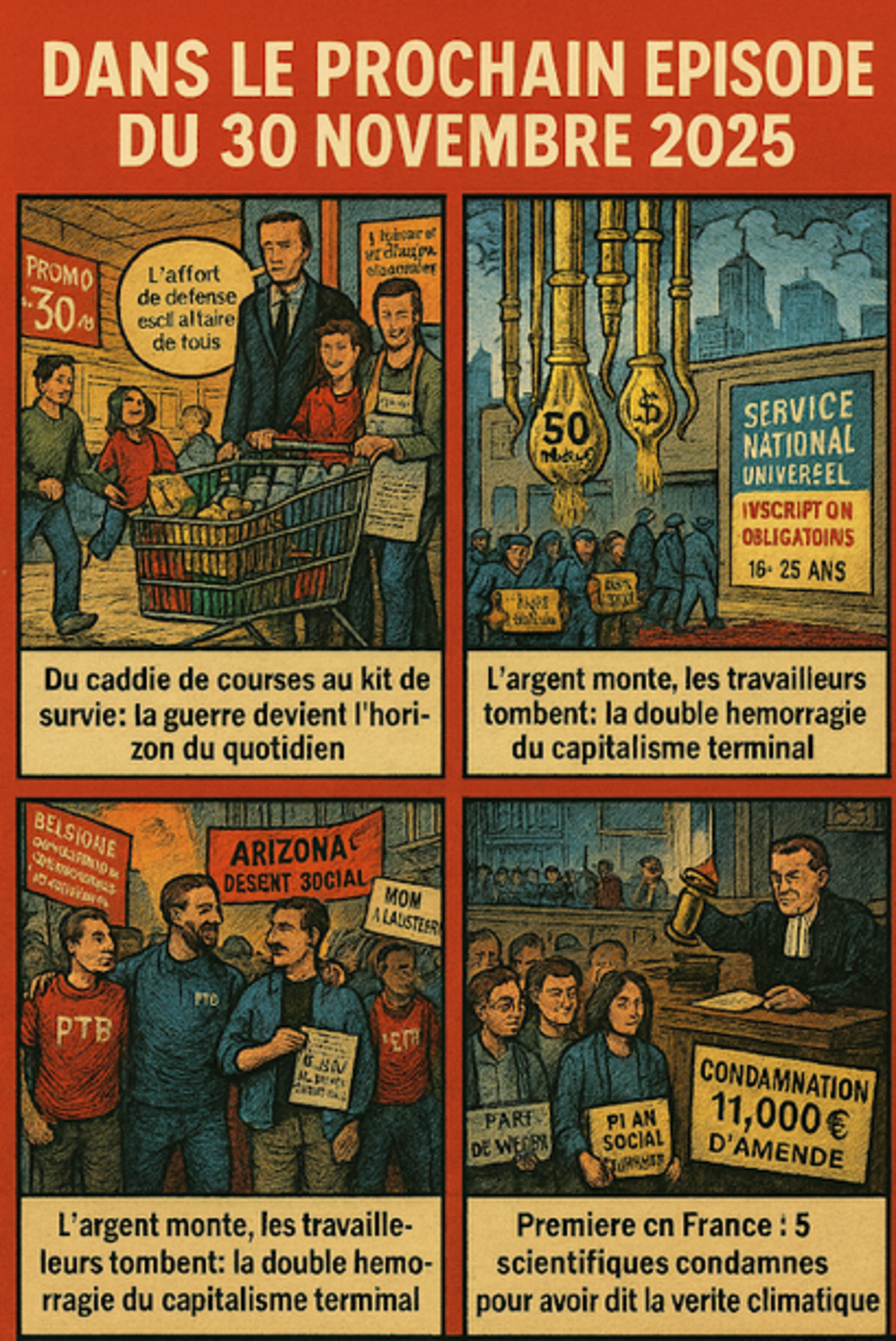 En Europe, l'adoption des budgets tourne au casse-tête généralisé. En Belgique, la deuxième journée de grève nationale contre l'austérité mobilise massivement : le secteur public s'est joint au mouvement avant une grève intersectorielle, tandis que l'accord budgétaire n'offre « aucune perspective pour les gens » selon la FGTB. L'indexation plafonnée des salaires, pensions et allocations frappera directement les revenus. En France, l'entente inattendue entre Donald Trump et Zohran Mamdani sème le trouble dans le camp MAGA, ravivant les débats sur la bataille culturelle gramscienne. Le général Mandon continue sa préparation idéologique à la guerre en demandant aux maires de préparer la population aux futurs conflits — une « propagande de guerre qui n'est pas un dérapage » selon Révolution Permanente. Emmanuel Macron multiplie les signaux bellicistes : service militaire, kit de survie, abandon progressif des Outre-mers dénoncé par Estelle Youssouffa.
