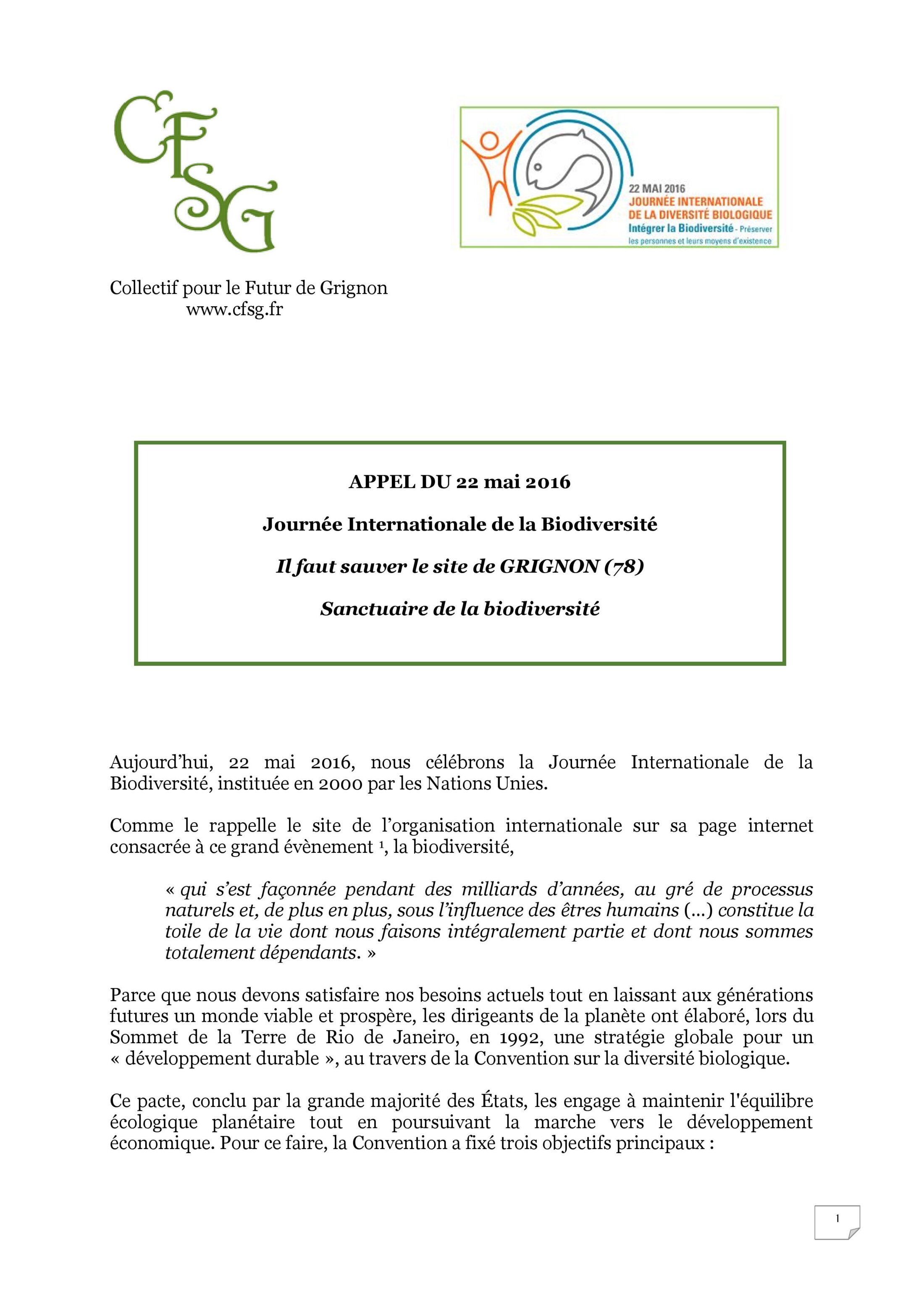 En cette journée internationale de la biodiversité, le Collectif pour le Futur du Site de GRIGNON répond à l’invitation de l'ONU et célèbre ce grand évènement en lançant un appel solennel aux autorités nationales, internationales, gouvernementales et non gouvernementales pour la sauvegarde du domaine de GRIGNON à THIVERVAL-GRIGNON (78), sanctuaire de la biodiversité, menacé de vente au PSG.