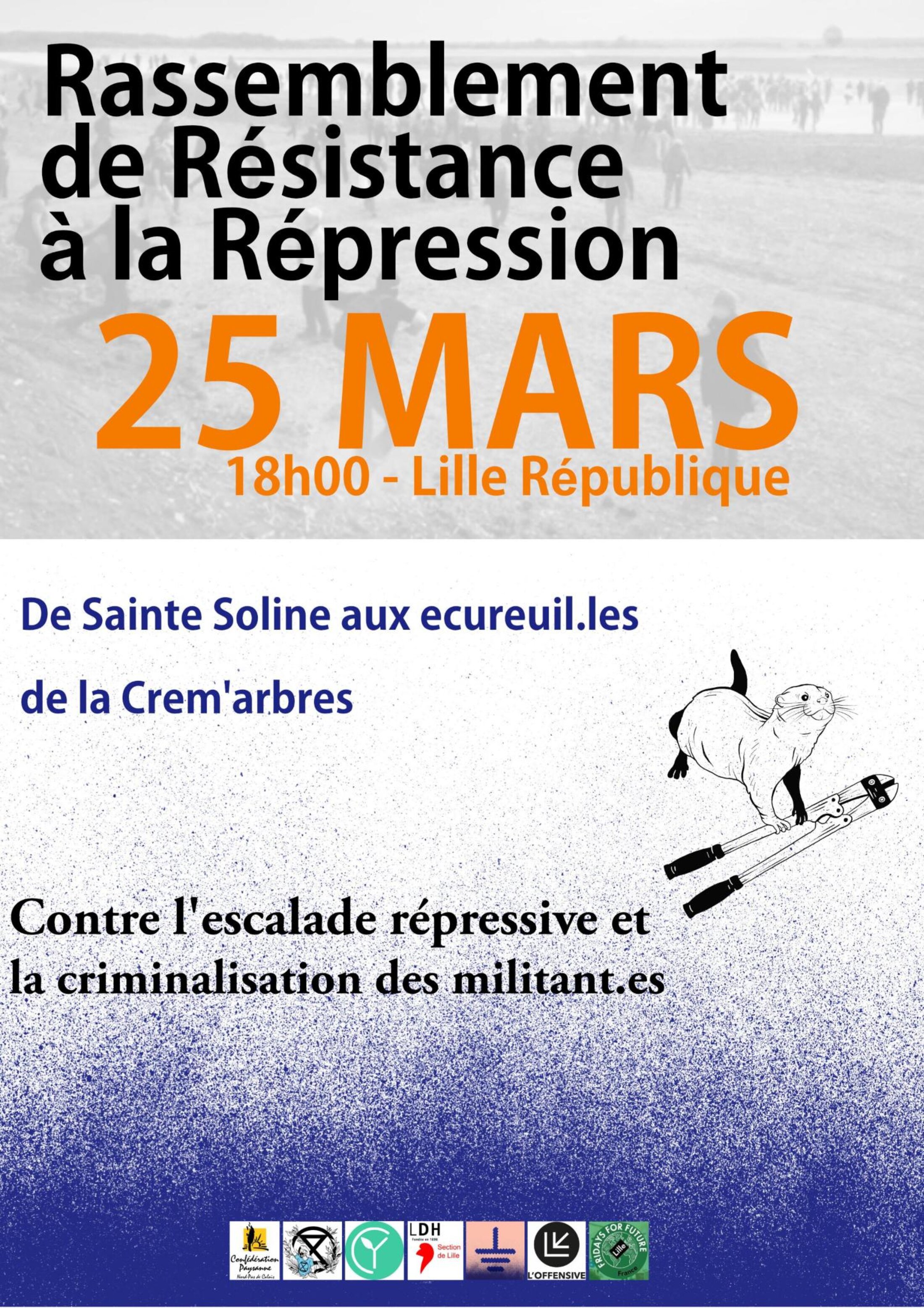 A Lille, le Comité local des Soulèvements de la Terre soutient et appelle à participer au Rassemblement de Résistance contre la Répression organisé par la Ligue des Droits de l’Homme de Lille à 18h00 Place de la République afin de soutenir les militant.e.s qui luttent contre les mégabassines dans le Poitou ou l’A69 dans le Tarn ainsi que pour dénoncer la répression générale des militant.e.s, syndicalistes, racisé.e.s…