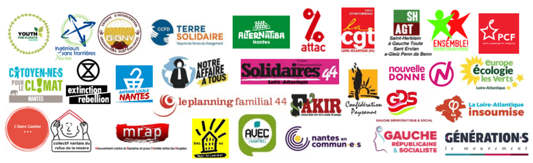 Signataires en Loire-Atlantique : Alternatiba Nantes, Attac 44, l'Autre Cantine Nantes, AVEC - association de veille écologiste et citoyenne, CCFD-Terre Solidaire 44, Citoyens pour le Climat et le Vivant Nantes, Collectif nantais du refus de la misère, Droit Au Logement 44 (DAL44), Extinction Rebellion Nantes, Fakir, I-boycott Nantes, Ingénieurs sans frontières Nantes, GIGNV, Notre Affaire à Tous-Nantes, Mouvement contre le Racisme et pour l’Amitié entre les Peuples (MRAP) 44, Planning Familial 44, Youth For Climate Nantes, Union Départementale CGT 44, Confédération paysanne 44, Solidaires 44, Collectif citoyen Saint Herblain à Gauche Toute / Sant Ervlan a-Gleiz Penn da Benn, EELV 44, Ensemble ! 44, La France Insoumise 44, Gauche Démocratique et Sociale 44 , Gauche Républicaine et Socialiste 44, Génération-s 44,Nantes en Commun·e·s, Nouvelle Donne 44, Parti Communiste Français 44