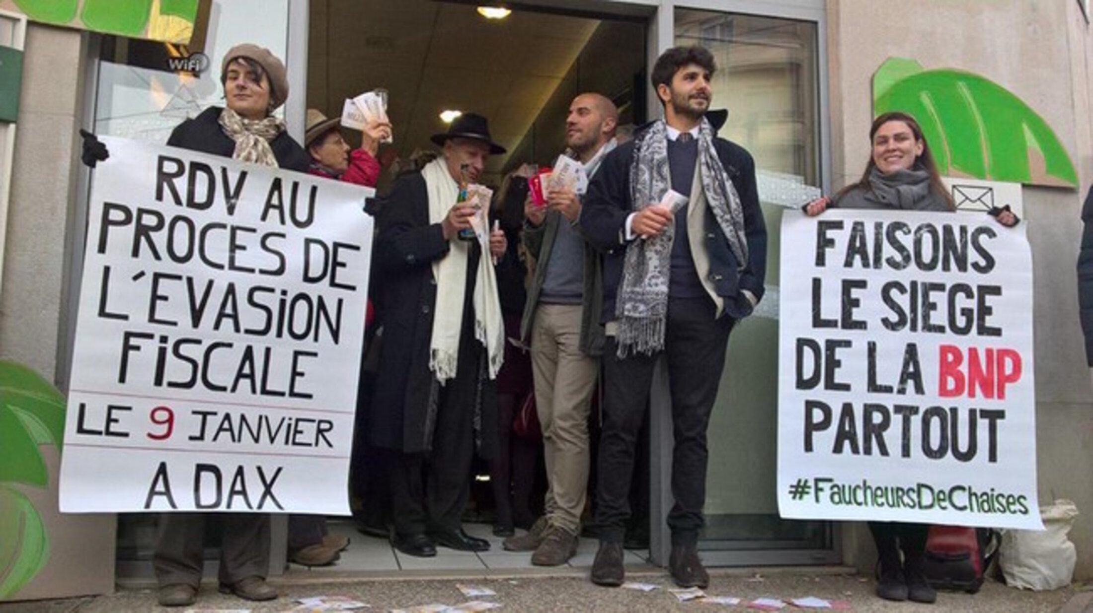 "Vendredi 9 et samedi 10 décembre, une vague d’actions touche la BNP Paribas pour dénoncer le système de l’évasion fiscale et appeler au financement de la transition écologique et sociale. Répondant à l’appel lancé par le collectif des Faucheurs de Chaises, des centaines de militants ont mené des actions non-violentes visant la BNP Paribas."