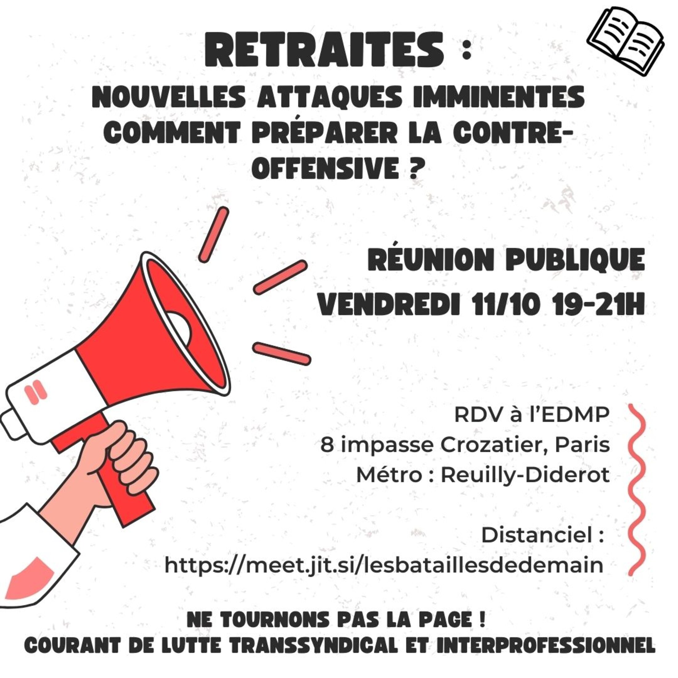 Retraites : Nouvelles attaques imminentes. Comment préparer la contre-offensive ? Réunion publique le vendredi 11 octobre 2024, 19-21h à l’EDMP, 8 impasse Crozatier, Paris Métro : Gare de Lyon, Ledru-Rollin, Reuilly-Diderot