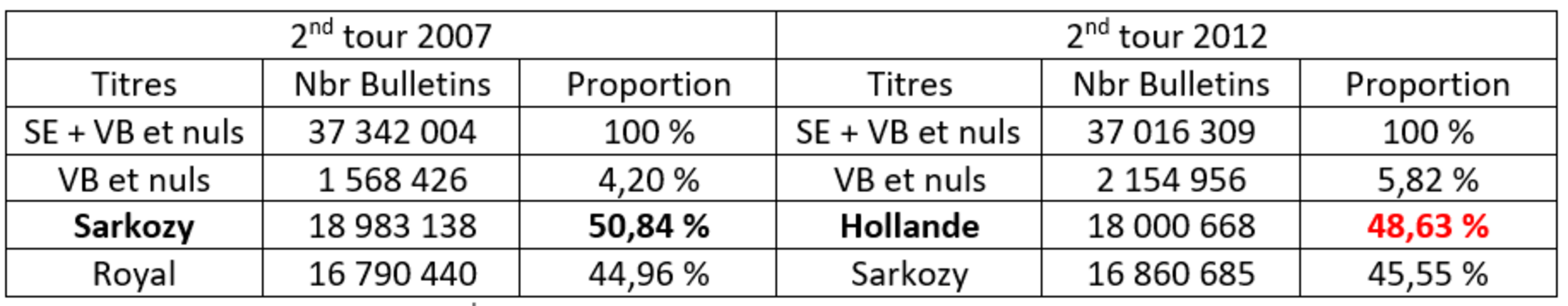 Tout cela alors que les votes blancs et nuls, s’ils étaient comptabilisés avec les suffrages exprimés, comme ils devraient l’être (au moins pour les votes blancs), auraient pu faire basculer certaines élections présidentielles. Comme on peut le voir dans le tableau ci-après (Tableau 1), M. Nicolas Sarkozy n’aurait remporté l’élection présidentielle de 2007 [8] que de très peu, et surtout, M. François Hollande n’aurait pas remporté l’élection présidentielle de 2012 [9] : il n’aurait pas récolté au moins 50 % des suffrages exprimés (SE) et des votes blancs (VB) et nuls.
