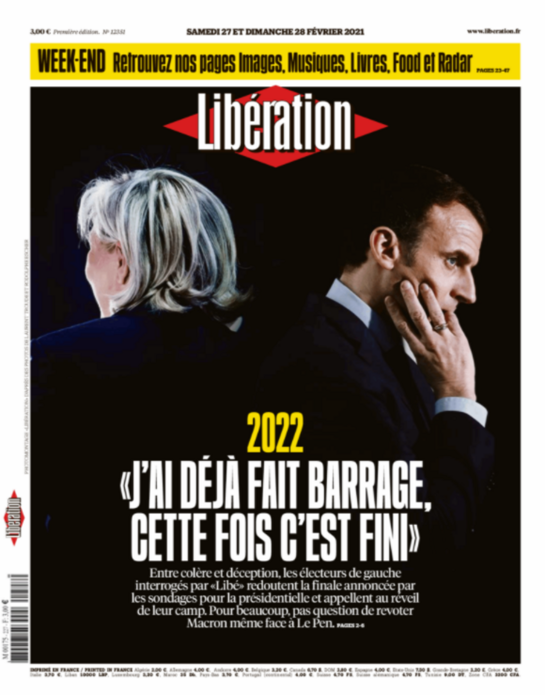 Il y a eu trop de mensonges pendant la crise du Covid, M. Macron. Pour résumer ma position, la Une du journal Libération, du 27-28 février 2021, me semble tout à fait appropriée : « J’ai déjà fait barrage, cette fois c’est fini ». (Figure 2)