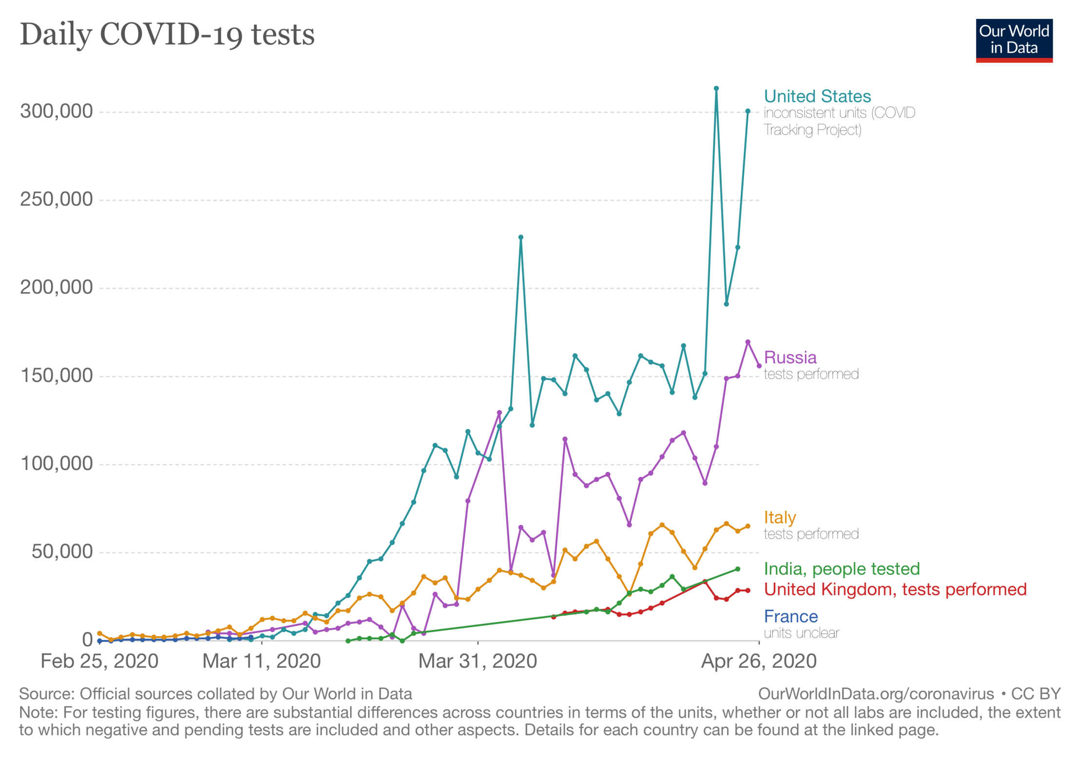 Au 13 avril 2020, 1 359 993 tests du Covid-19 ont été réalisés en Russie [*], ainsi maintenant en deuxième position mondiale pour cet indicateur, derrière les États-Unis (2 833 051 tests), et maintenant devant l’Allemagne (1 317 887, mais cette statistique date du 8 avril) et l’Italie (1 010 193 tests au 12 avril). La France était à 333 807 tests le 7 avril. La Russie est montée assez rapidement à 100 000 tests par jour, comme le montre le graphique suivant (fait à partir du site Our world in data).