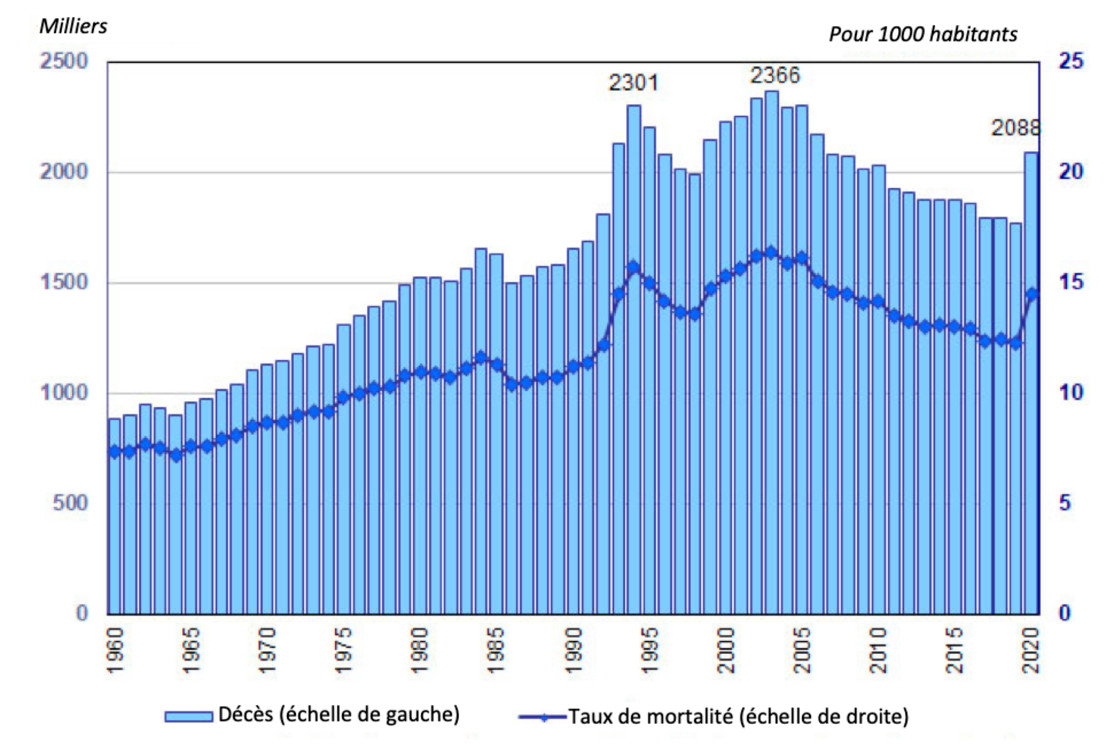 Selon ces statistiques provisoires de Rosstat, 2 124 500 décès ont été enregistrés en 2020 en Russie, soit une augmentation de 18 % et de 323 000 en chiffres absolus par rapport à 2019. Le taux brut de mortalité augmente de plus de deux points, passant de 12,3 ‰ en 2019 à 14,5 ‰ en 2020.