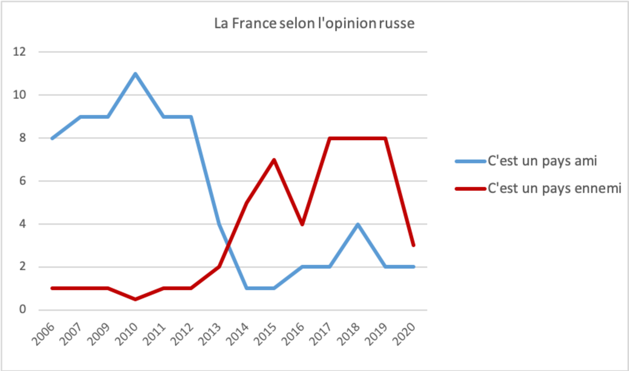 Et la France, au passage ? Si personne ne songe à y intervenir, elle n’est plus considérée par les Russes comme un pays ami. Seuls 2 % d’entre eux donnent cette réponse, ils étaient 11 % à le faire en 2010. Et plus, 3 %, voient en nous des ennemis. Pourquoi pas des ogres corses ?
