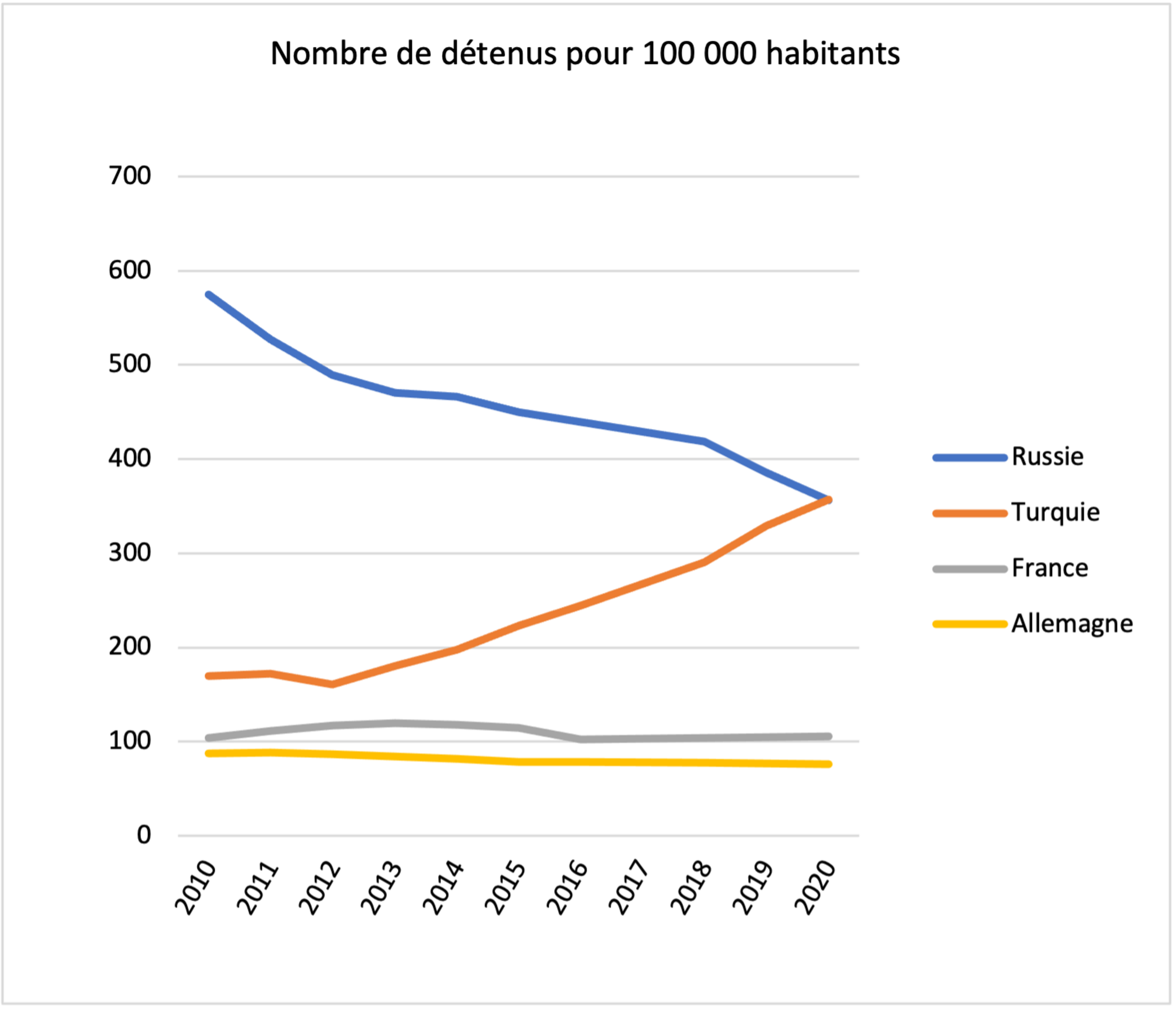 On voit que la Russie reste, parmi les pays du Conseil de l’Europe, un de ceux dont la population carcérale par habitant est la plus élevée. Elle était pour être plus précis en deuxième position dans le classement s de SPACE I en janvier 2020, avec 356,1 prisonniers pour 100 000 habitants, immédiatement derrière la Turquie (357,2). La moyenne était à 124,0, la médiane à 103,2. Le taux était de 105,3 pour la France, un peu au dessus de la médiane.
