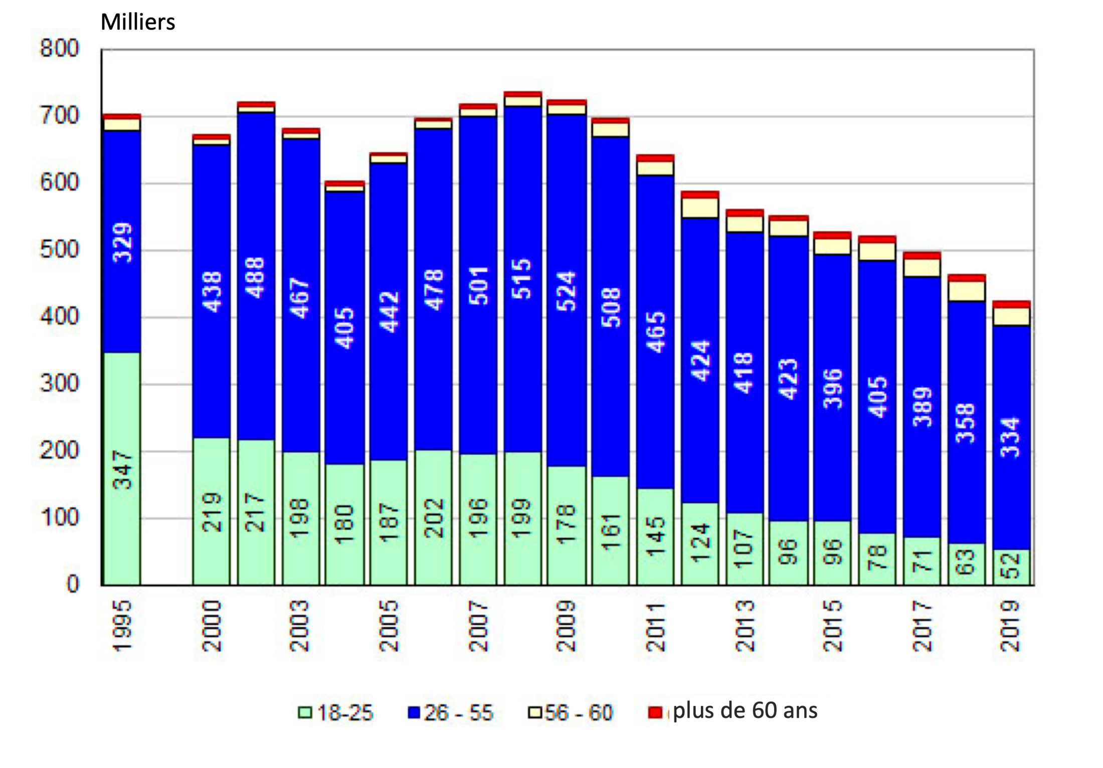 Le nombre et la part des personnes dans les centres de détention provisoire ont diminué continument jusqu’en 2010. La baisse s’est poursuivie ensuite en volume, mais leur par relative a ensuite augmenté. Elles sont 100 900 en 2019, soit presque 20 % du total (30 % en France).