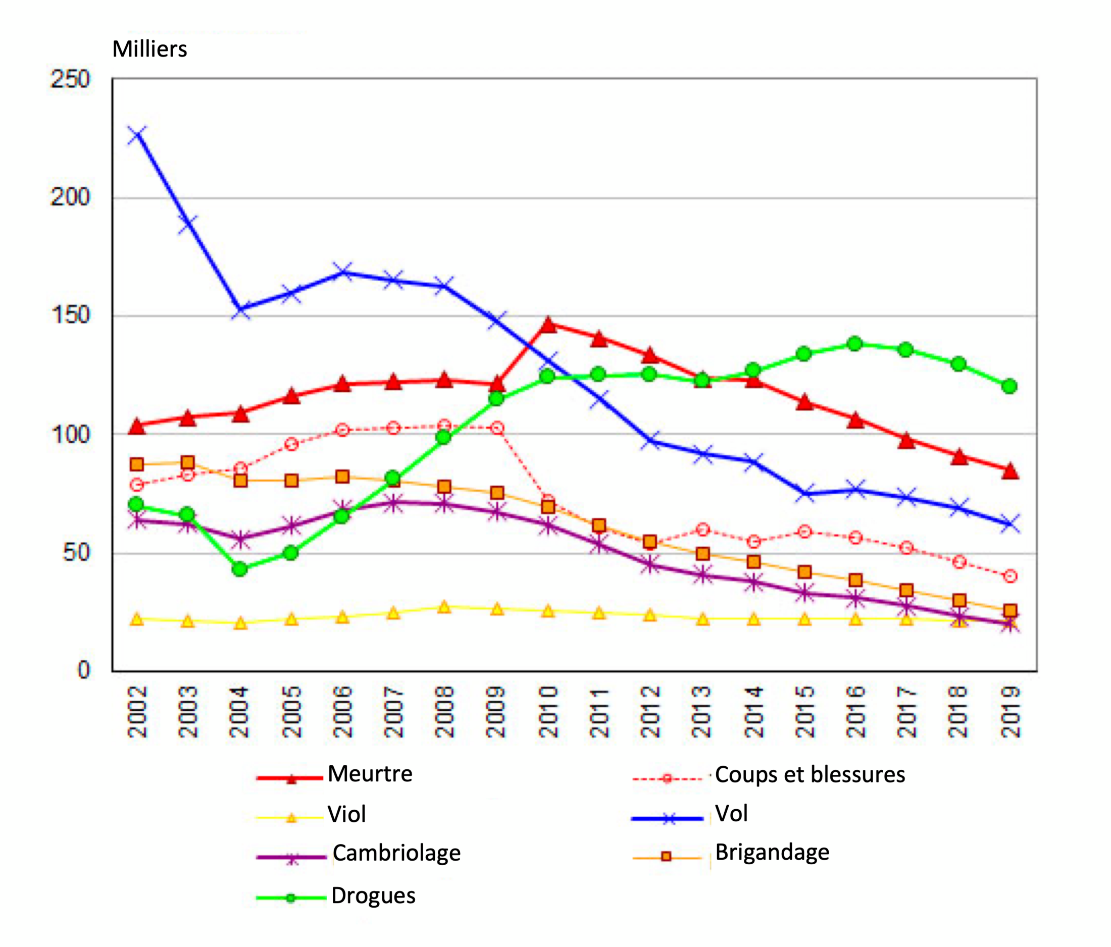Pour tout les autres motifs de condamnations, il y a une baisse, notamment pour les meurtres, après 2010, et, de façon continue et importante sur toute la période, pour les vols.