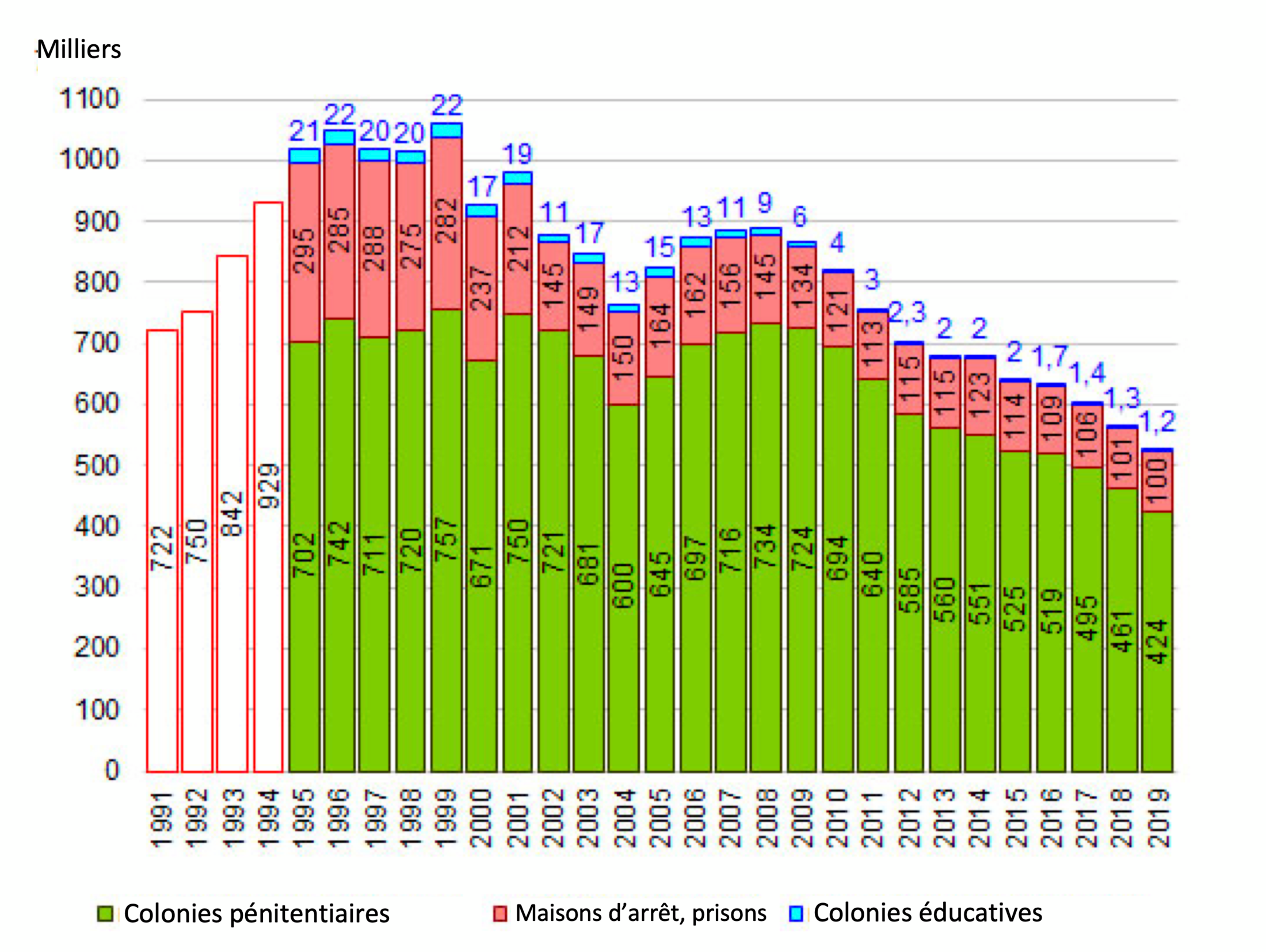 Le nombre des mineurs dans les colonies éducatives a lui aussi diminué très sensiblement, de 22 000 en 1999 à 1150 en 2019. 927 mineurs sont par ailleurs en détention provisoire.
