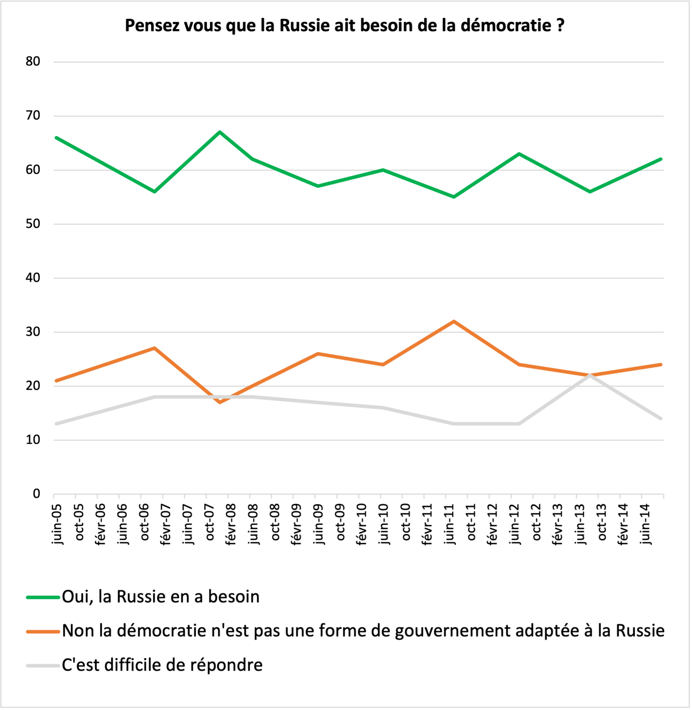 Ce qui me semble le plus significatif dans ces résultats, c’est qu'avec cette question plus ouverte, le nombre de ceux qui indiquent que la Russie n’a pas besoin de la démocratie tombe à 5 % en 2015. On peut facilement en conclure qu’il y a besoin de préciser ce que veut dire le dire le mot démocratie, pour les Russes (et probablement pour nous aussi), avant de mesurer le niveau d'adhésion qu'il suscite.