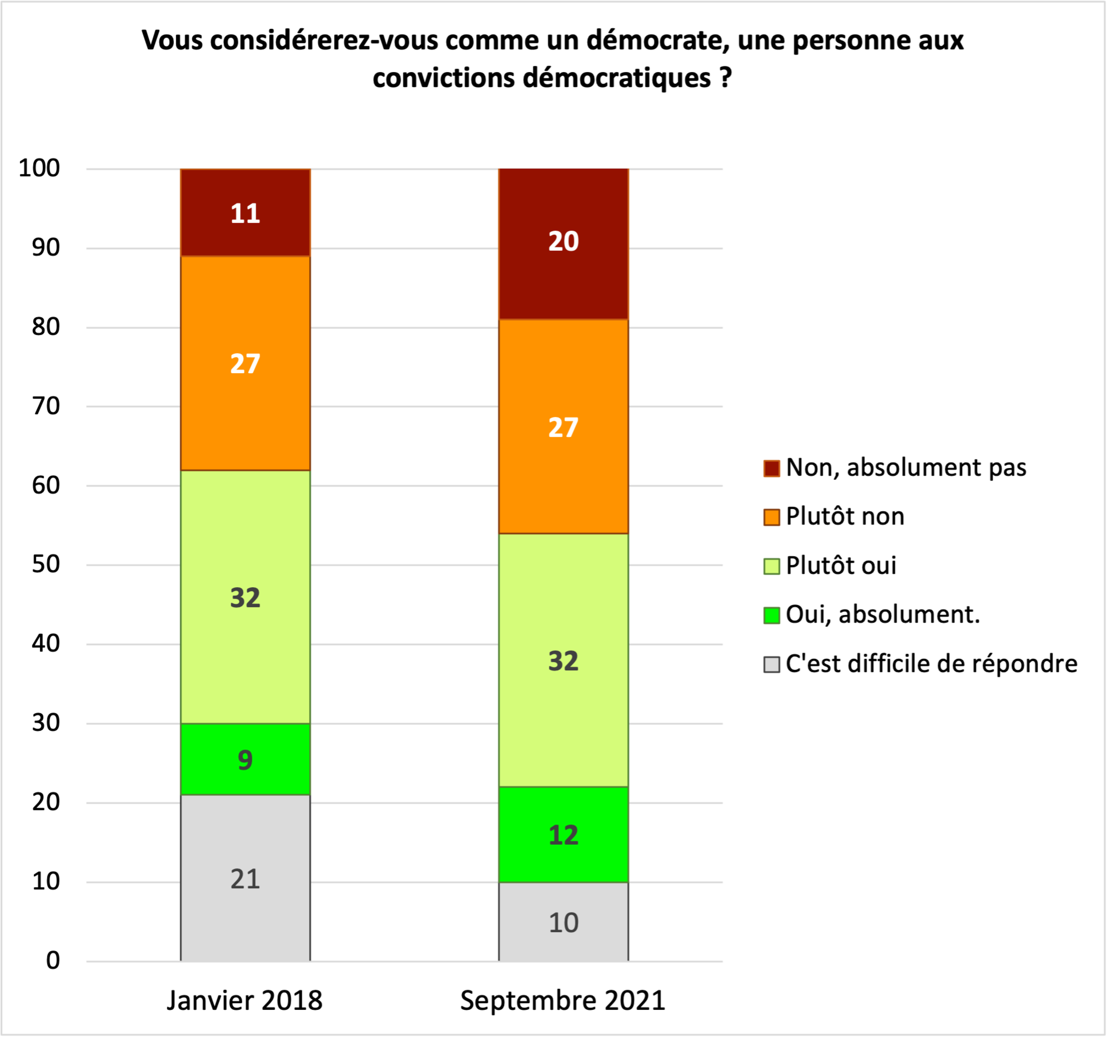 Pour objectiver un peu, je peux m’appuyer sur un sondage tout récent du centre Levada. Il a été réalisé entre le 23 et le 29 septembre 2021, dans les règles de l’art, et porte sur la position des Russes sur la démocratie, le socialisme et les idées de gauche, et l’économie de marché. On peut en consulter ici les résultats détaillés, en anglais. Pour ce qui concerne le premier point, le nombre des répondants qui déclarent avoir des convictions démocratiques (44 % au total, avec 12 % de oui, absolument et 32 % de plutôt oui) est dépassé par celui de ceux qui déclarent ne pas en avoir (47 %, dont 27 % de plutôt non et 20% de non, absolument).