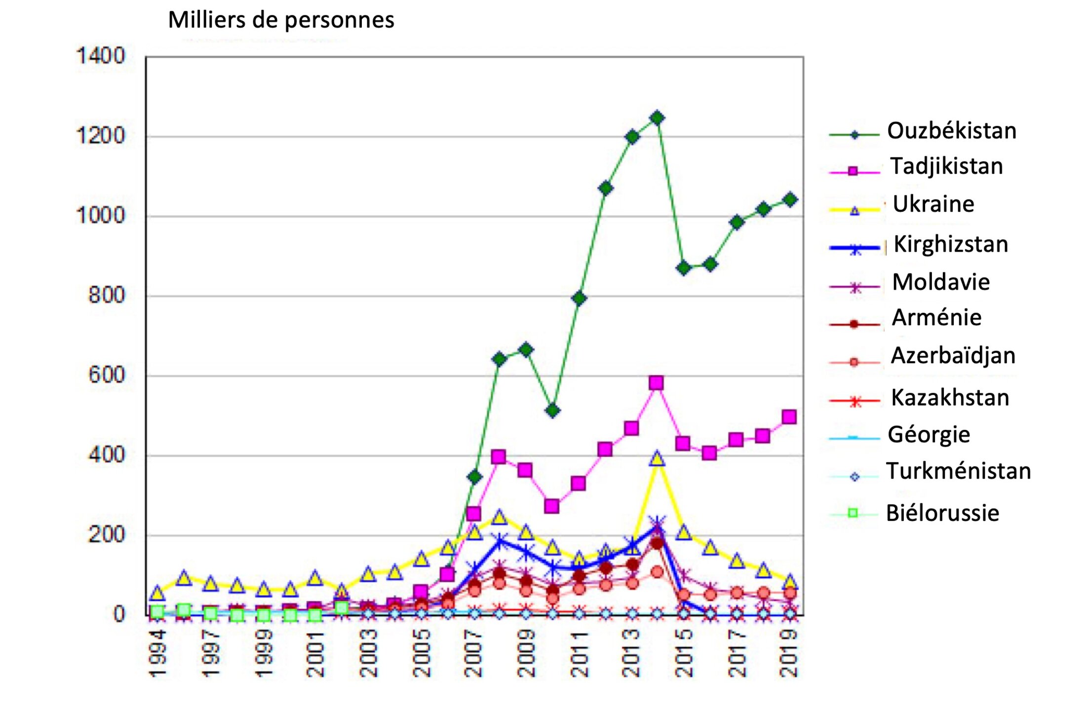 Le nombre de travailleurs étrangers travaillant légalement en Russie était à la fin de 2019 de 1,69 millions. Il a connu une nette augmentation à partir de 2006/2008, jusque’à un pic de 2,87 millions en 2014, puis une baisse, pour revenir à son niveau actuel, qui semble être un étiage.