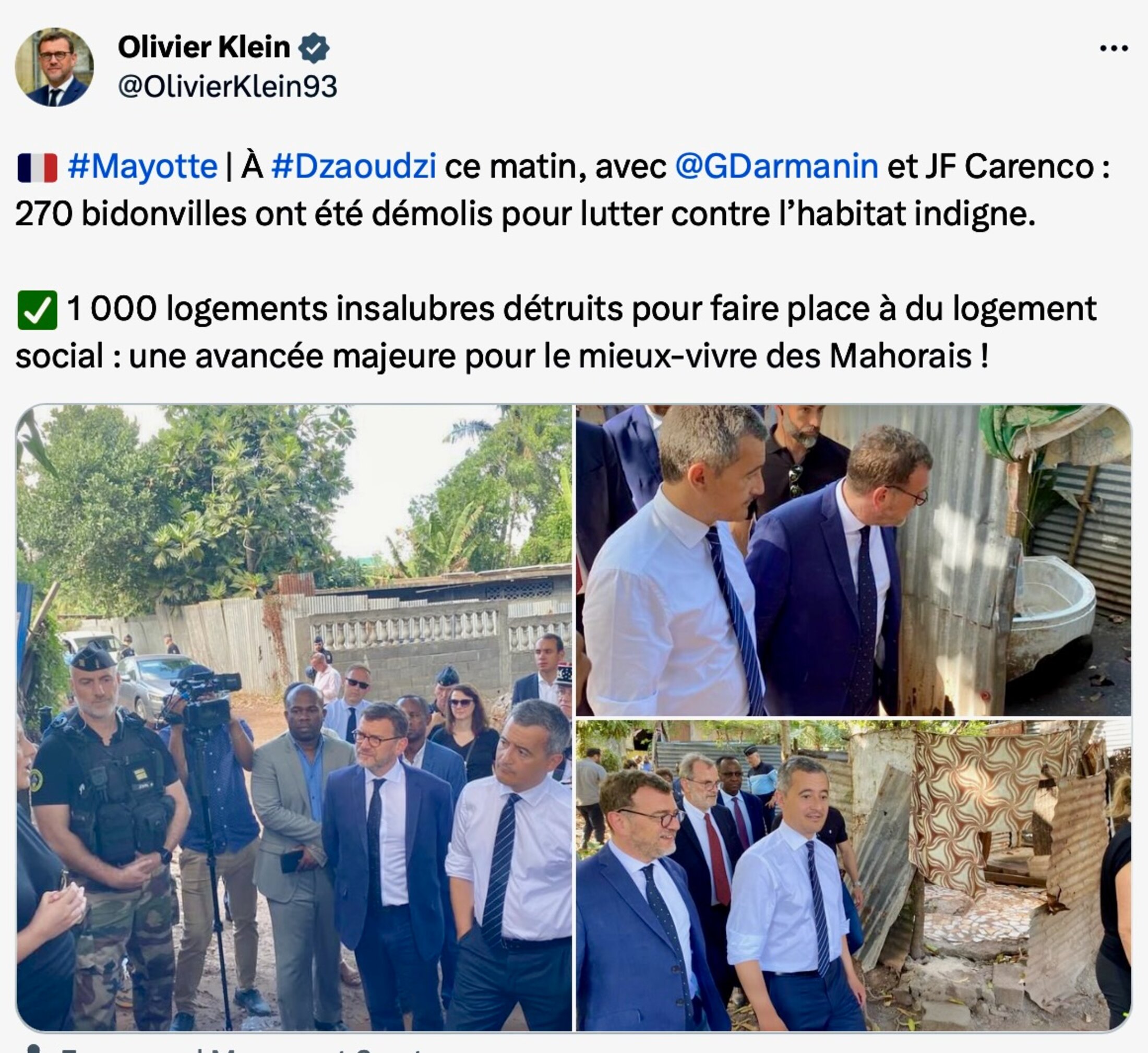 Ainsi sur place le ministre de l’Intérieur flanqué de deux ministres auxiliaires peut dresser le bilan de deux mois d’opération : sur son fil Twitter, il s’honore que : « grâce au travail du préfet, nous avons déjà pu procéder à 270 destructions de bangas, ces bidonvilles de tôle. Notre objectif est de parvenir à la destruction d’un millier de logements insalubres d’ici à la fin de l’année. »