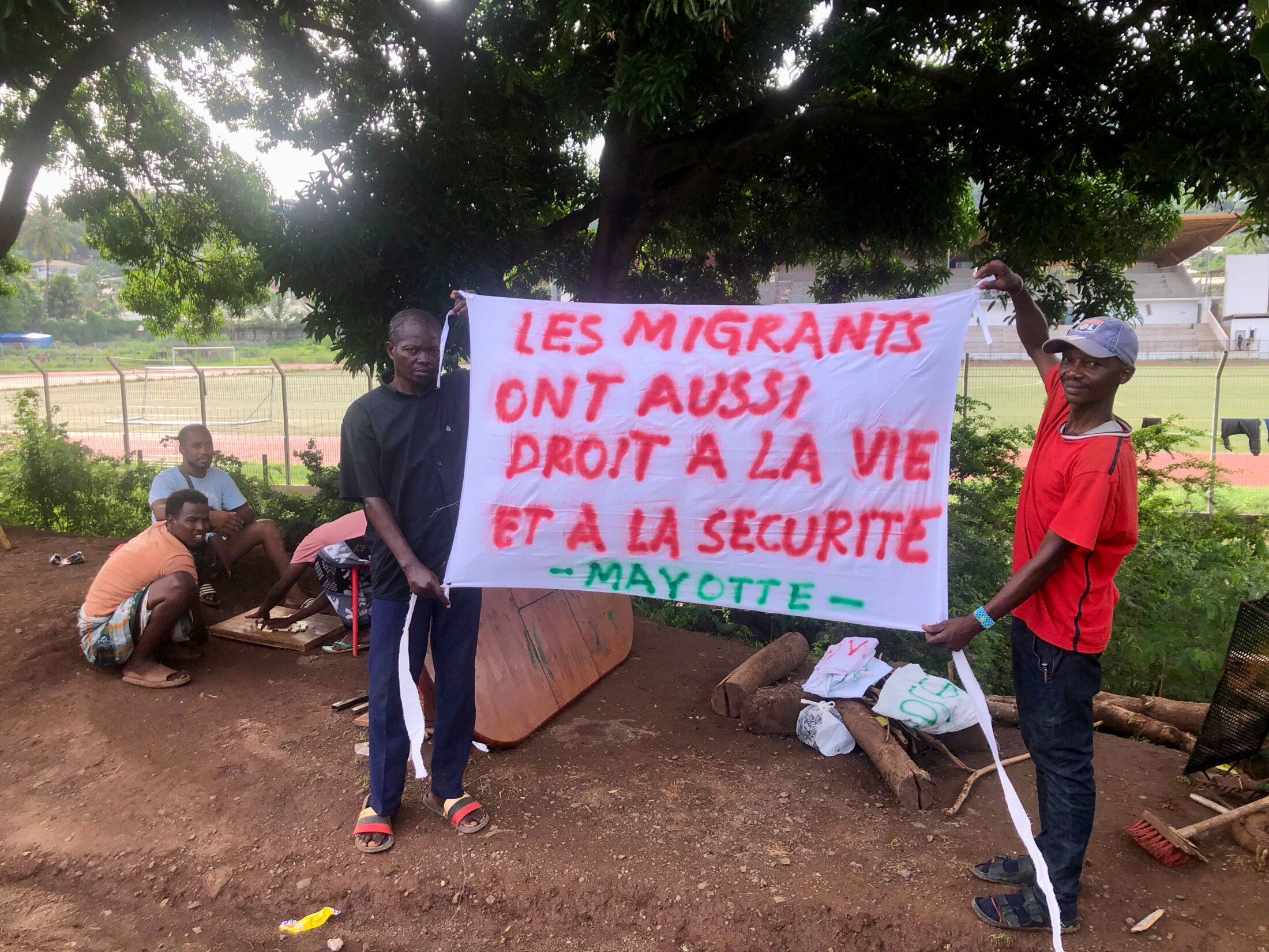 Dimanche matin, environ 300 personnes se sont rassemblées sur la pelouse du stade pour réclamer le démantèlement du campement. Une tentative d'intrusion a été empêchée par un mur humain. Plusieurs femmes et enfants ont préféré sortir de l'enceinte vu les risques de violence que l'assaut annonçait. Toutes les banderoles porteuses d'un slogan humaniste accrochées à la clôture entourant le stade ont été arrachées et déchirées par un manifestant casqué. Mais finalement les participants à l'appel se sont calmés et regroupés autour d'un petit chapiteau installé au centre du terrain de foot. Se sont alors succédés plusieurs orateurs s'exprimant exclusivement dans la langue locale peu compréhensibles aux migrants qui eux parlent français pour la plupart, à l'exception des Somaliens arabophones plus à l'aise en anglais. Les propos assez confus dénonçaient les nuisances causées par les Africains, réputés mauvais, cruels et sales. Le dernier orateur a rappelé à la population "qu'il ne fallait pas se tromper d'adversaire, que leur adversaire était l’État français incapable de les protéger des migrants”. Répétant sa phrase fétiche : “Nous Mahorais, pour causer on cause”, et interrogeant : “et pour oser, on ose ?”, cette jolie trouvaille répétée plusieurs fois. Et enfin d'inviter l'assemblée à se rendre à la préfecture pour exprimer la colère, et à fermer le tribunal et l'aéroport.