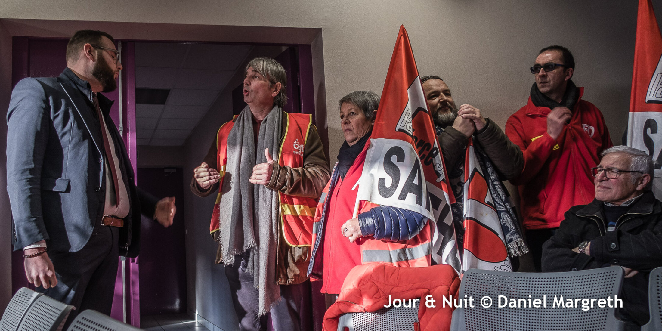 Ce samedi 18 janvier 2020 au Mans, 45ème jour de la grève, il faisait un superbe soleil et une température fraîche mais c’était sans compter sur les manifestants contre la réforme des retraites qui allaient réchauffer l’atmosphère depuis le début d’après-midi en zone commerciale nord jusqu’à la cérémonie des vœux et la galette du député LREM Damien Pichereau!