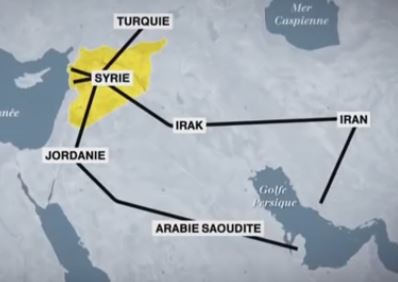 Puis, après avoir rappelé le choix de Bachar el-Assad pour le pipeline iranien (en juillet 2011) et son refus de celui du Qatar (en 2009), Alain Juillet, président de l'Académie d'intelligence économique, évoque le très fort mécontentement de l'Arabie saoudite et du Qatar, qui virent ce nouveau projet comme une concurrence inacceptable pour leurs propres livraisons de pétrole, et qui auraient par voie de conséquence considéré qu'il fallait renverser Bachar el-Assad. La voix-off nous dit alors :