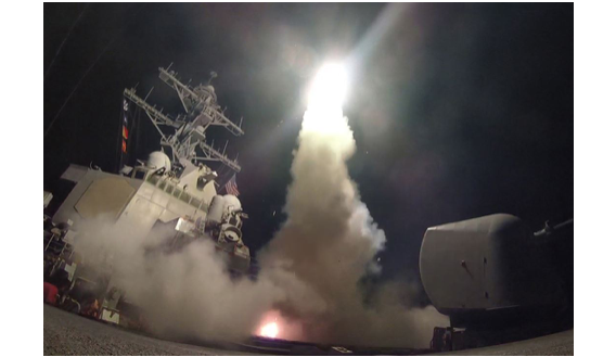 Le destroyer à missiles guidés USS Porter effectue des opérations de frappe contre une base aérienne syrienne depuis la Méditerranée, le 7 avril 2017 (Photo de la Navy par le sergent de marine 3e classe Ford Williams).