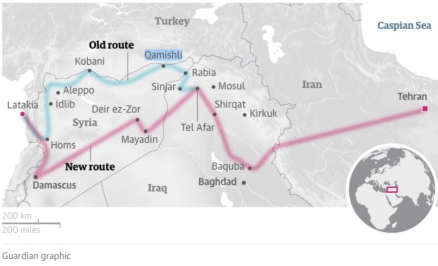 Les responsables iraniens disent que la nouvelle route choisie part de Deir Ez-zor vers Sukhna et Palmyre, puis Damas, et vers la frontière libanaise, où le but principal d’encourager le Hezbollah pourrait partiellement être atteint par des changements démocratiques. De là, un passage vers Latakia et la mer Méditerranée a aussi été envisagé, donnant à l’Iran une voie d’acheminement qui éviterait les eaux du Golfe Persique couvertes de patrouilles.à