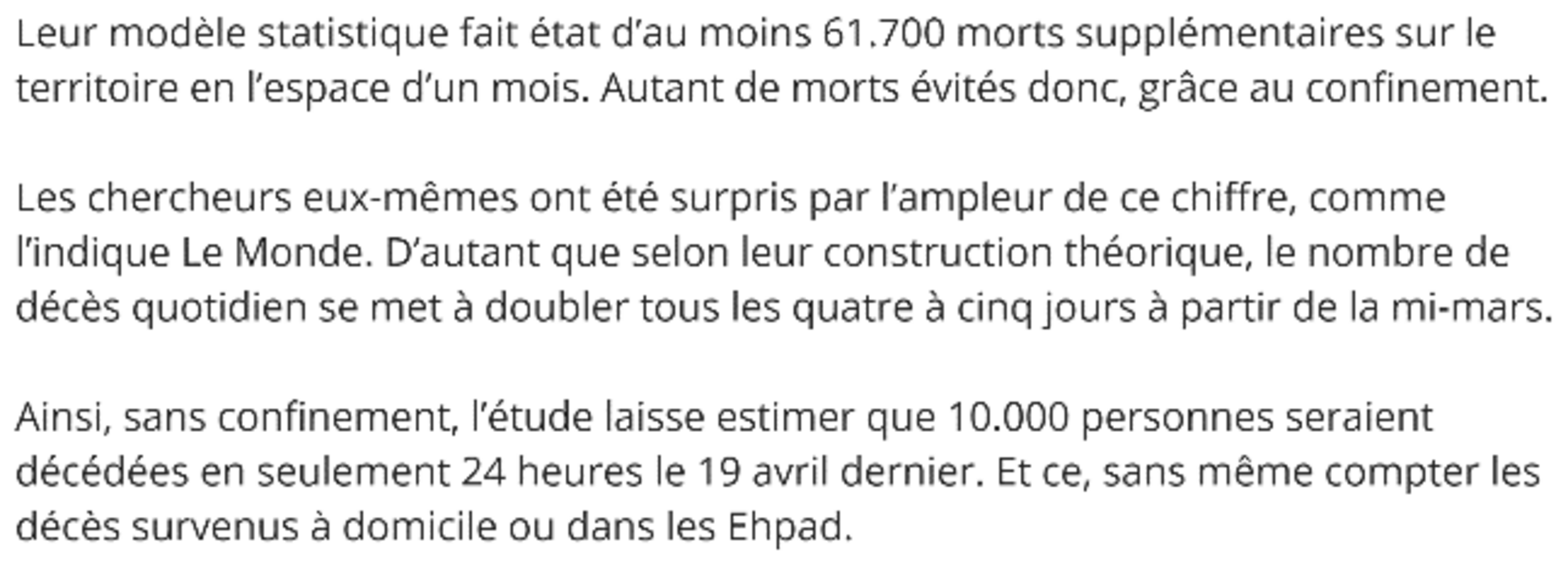 L’étude épidémiologique de l’EHESP, datée du 22 avril[1], arrive à des conclusions pour le moins surprenantes en évaluant à plus de 60’000 décès hospitaliers épargnés en France par les mesures de confinement entre le 19 mars et le 19 avril. Cette somme interpelle car, du début de l'épidémie au 31 mars, l'évaluation publiée par l'Imperial College britannique associé avec le bureau compétent de l'OMS (voir le rapport en anglais No 13), estime pour la France le nombre de décès épargnés par ces mêmes mesures à environ 2’500 avec un intervalle de confiance à 95% de [1000-4800].